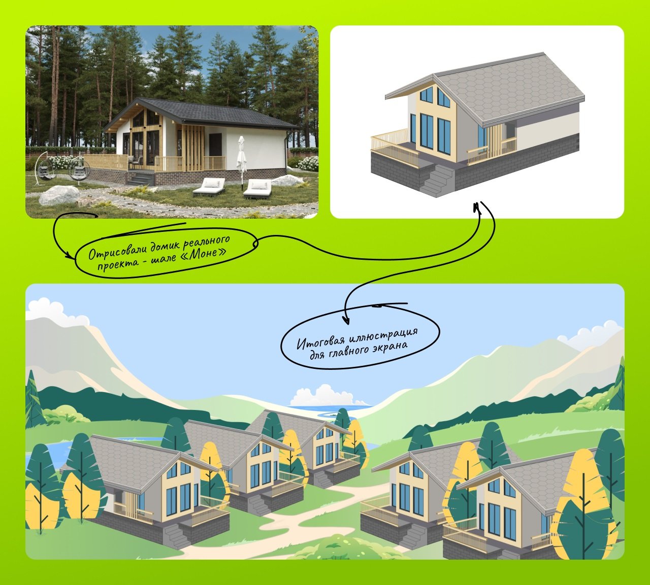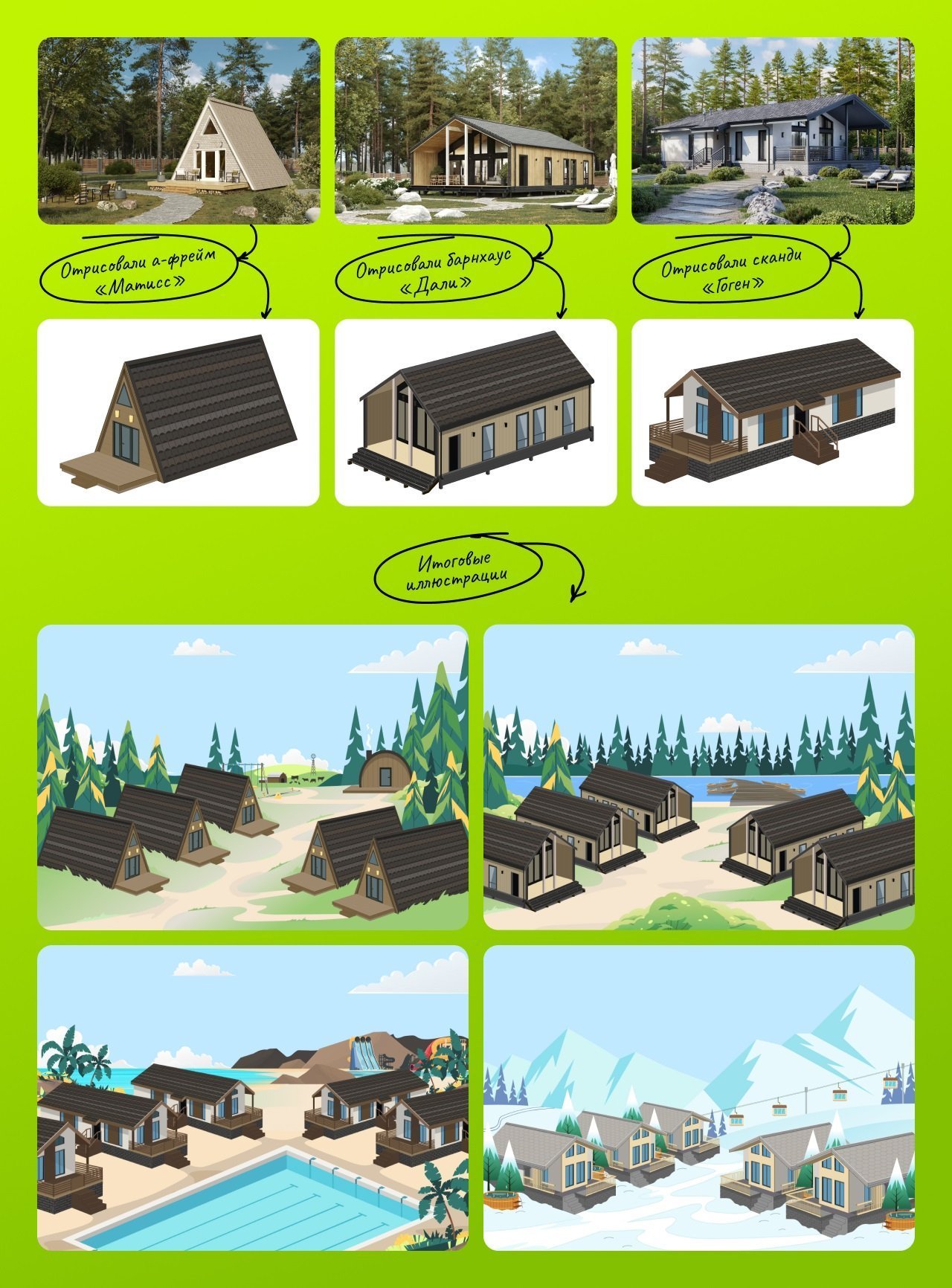 Отрисовали 4 домика по мотивам реальных проектов домов от Технониколь. Обыграли каждый зимними и летними пейзажами, разными природными ландшафтами.