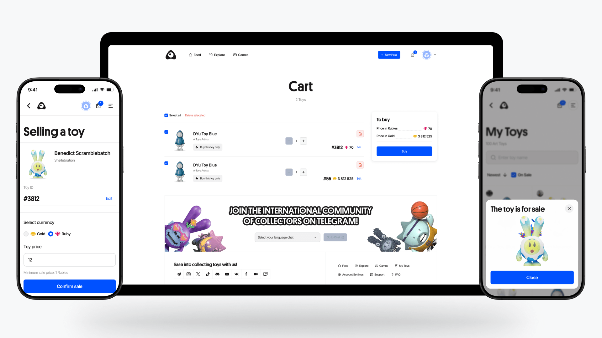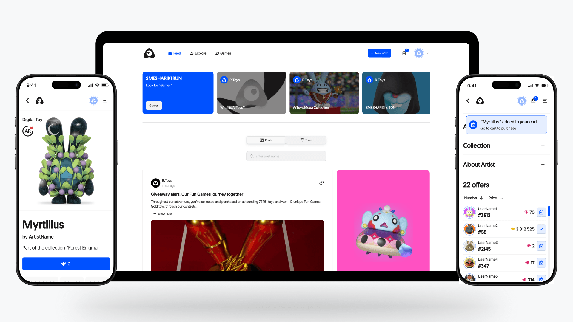 Наша команда создала не просто платформу, а новый цифровой мир, где художники и создатели digital игрушек объединяются, формируя пространство для творчества и взаимодействия. Добавлены удобные посты и медиасценарии, которые расширяют возможности общения, публикации новостей и обмена опытом, что делает общение на платформе ещё более живым и насыщенным. Внедрение расширенных функций покупки и продажи превратило R.Toys в изысканное цифровое пространство для коллекционеров и авторов.