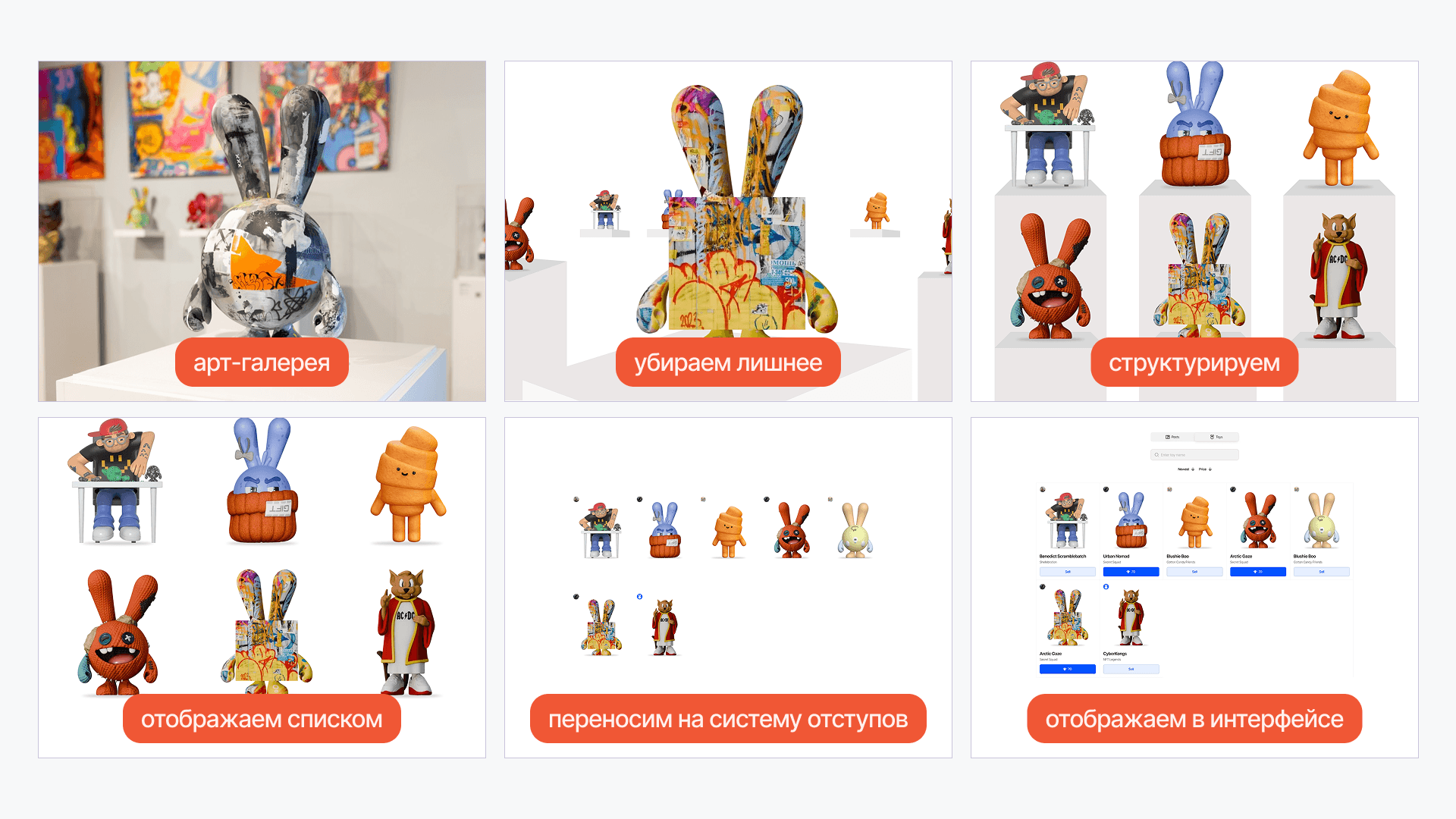 Дизайн выполнен в стиле художественной галереи — каждая игрушка выделена в отдельной рамке, что помогает удерживать постоянный визуальный контакт. Интерфейс структурирован с чёткими отступами и удобным списком, обеспечивая комфортное восприятие и лёгкую навигацию. Минималистичный стиль акцентирует внимание на арт-объектах без лишнего визуального шума, создавая лёгкое и приятное восприятие.