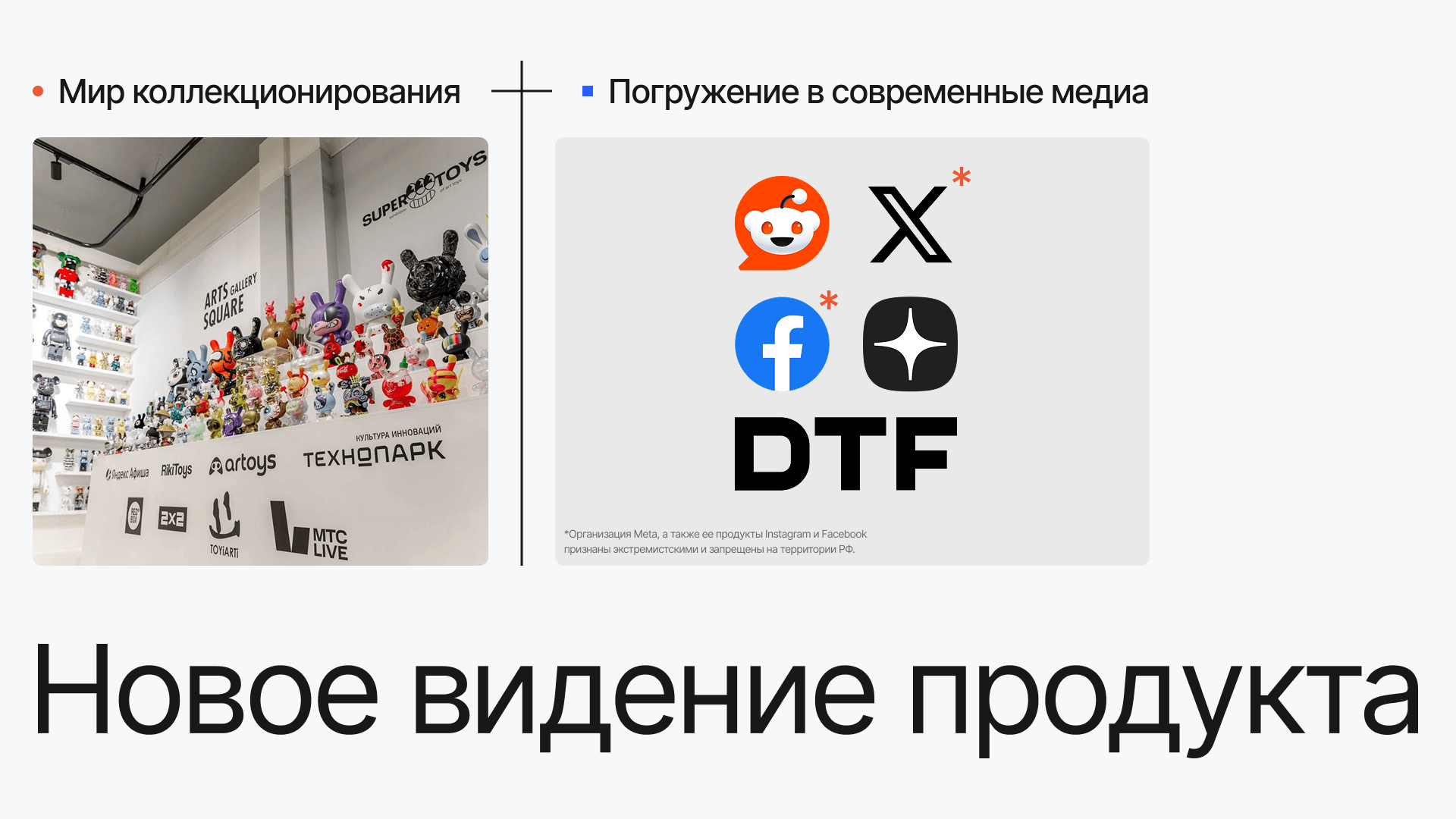 R.Toys — цифровая платформа для коллекционеров и авторов диджитал-игрушек, объединяющая NFT-энтузиастов и ценителей цифрового искусства. После успешного старта как ArToys команда планировала трансформировать продукт: добавить медиаформат, усилить сообщество и повысить LTV.