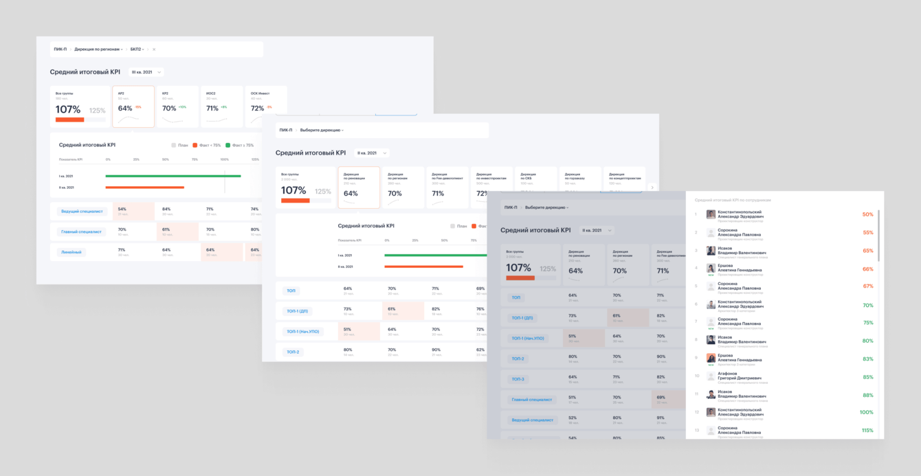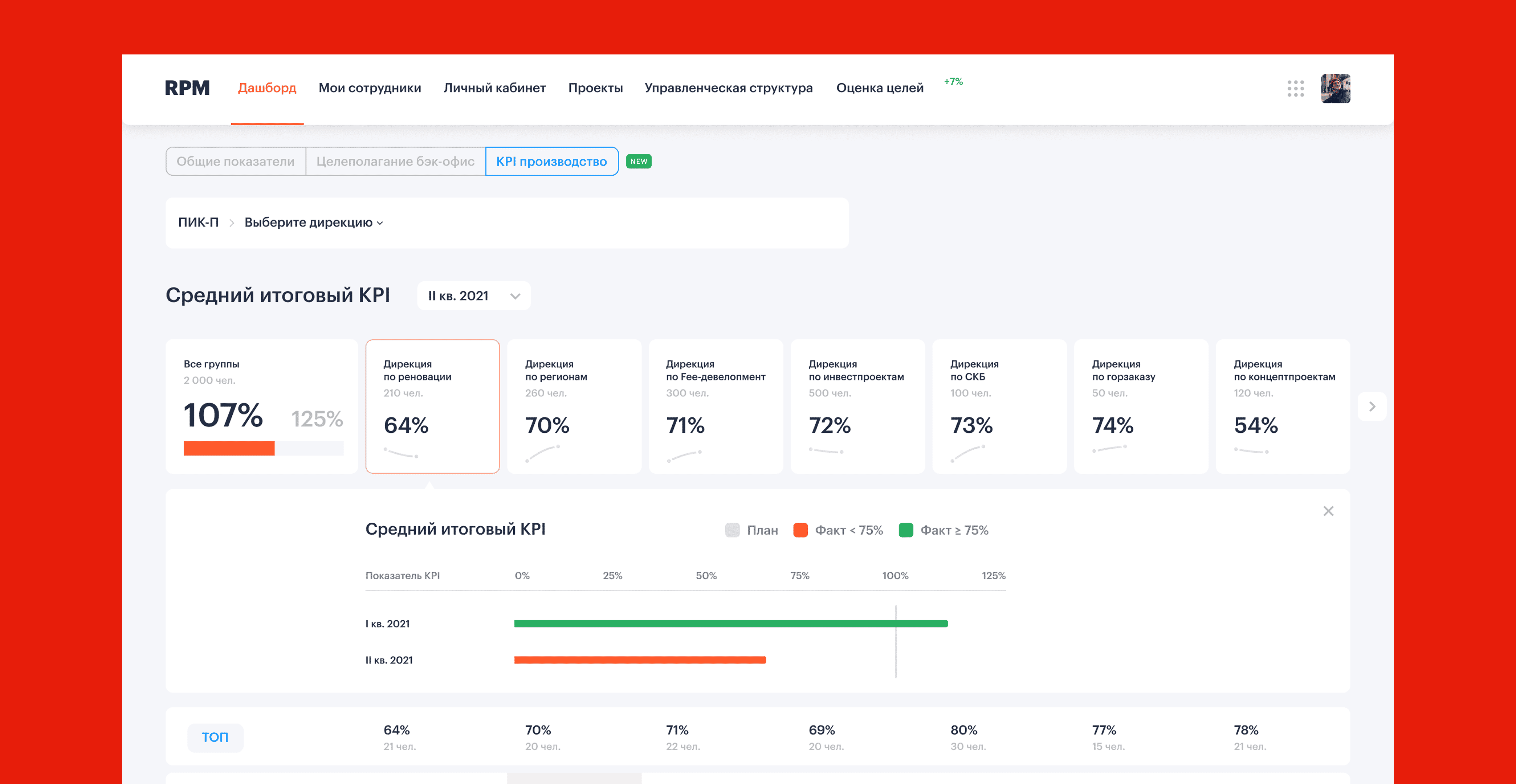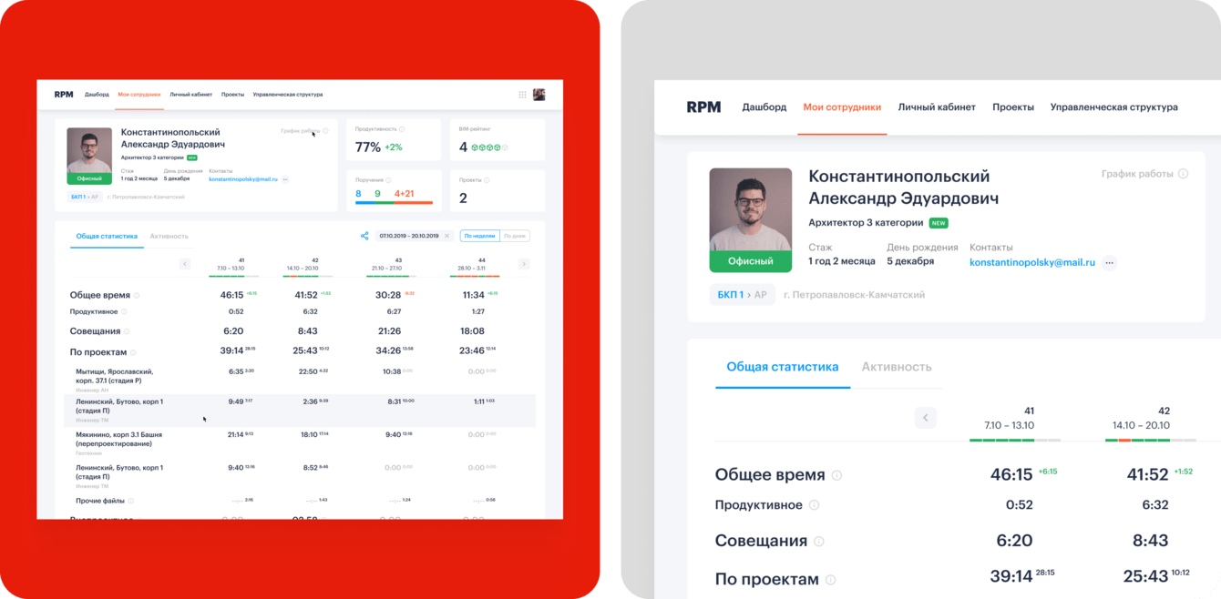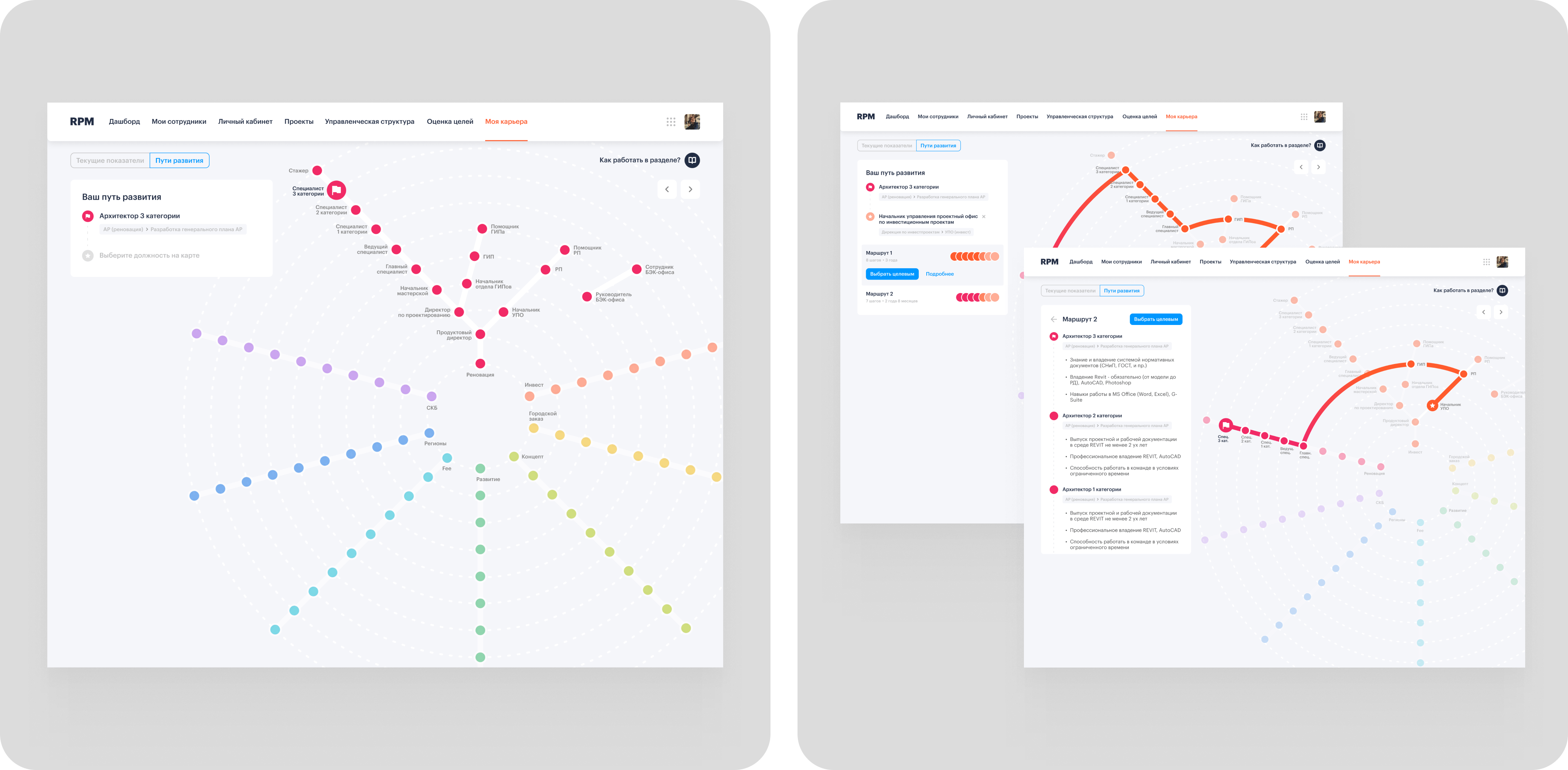 Интерфейс RPM-системы стал более удобным и эффективным для использования. Теперь там можно увидеть и личные карточки продуктивности для каждого сотрудника, и разделы по работе с проектами и задачами, и даже есть радиальная цветная карта развития в карьере.
