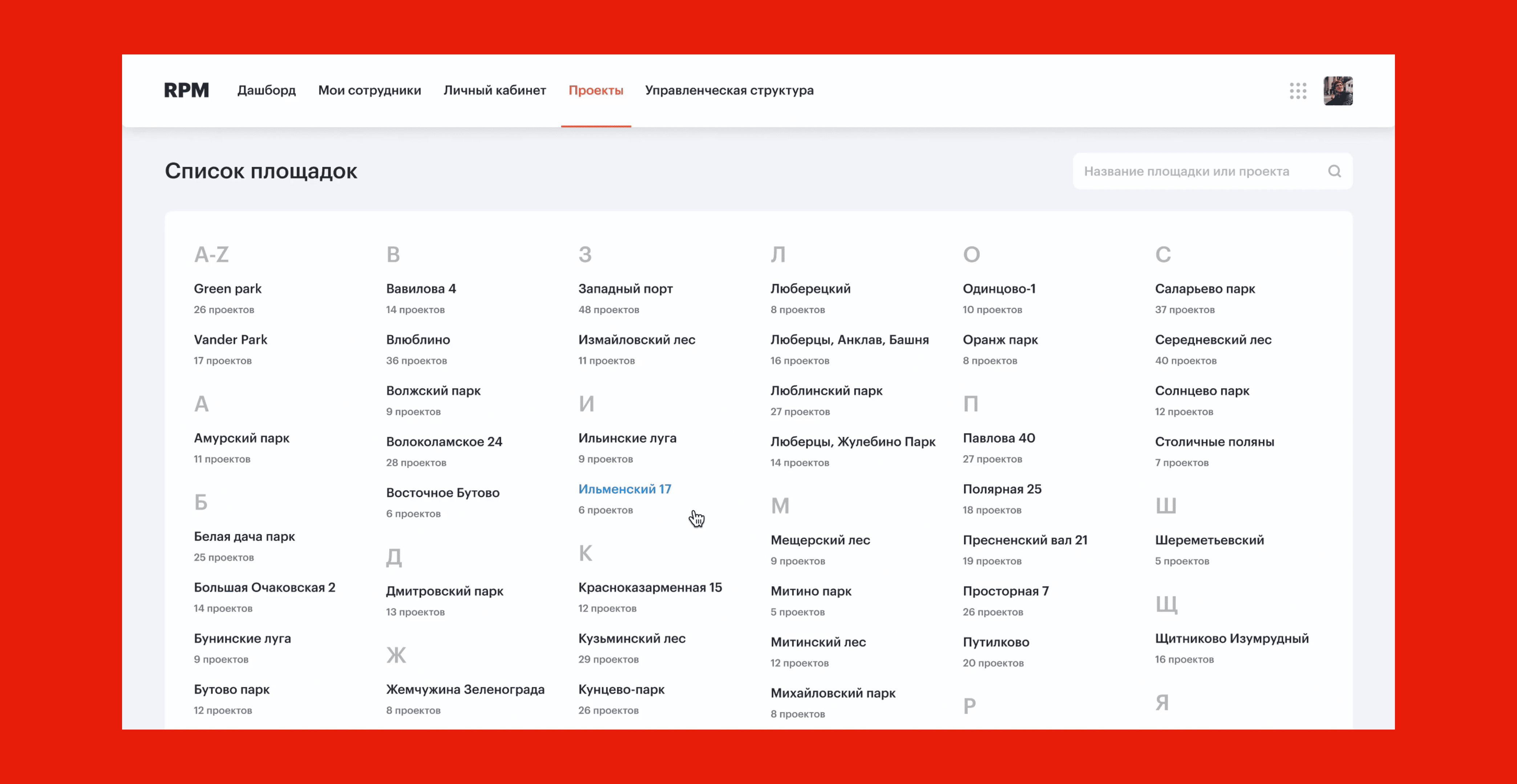 Внутри ПИК Planner мы спроектировали и разработали один из ключевых интерфейсов — раздел «Проекты», где каждый пользователь получает доступ к полной информации по текущим объектам.