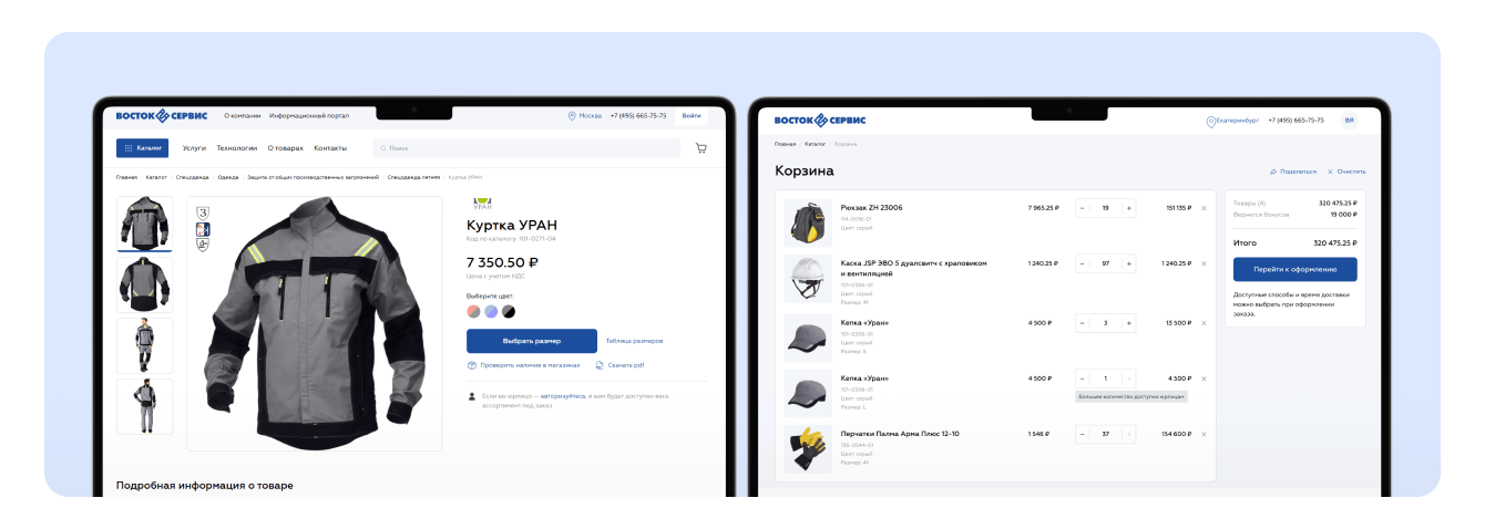 Настроили B2B-корзину на продажи под заказ. Если пользователь регистрируется, как юридическое лицо, то сайт позволяет оформить заказ без ограничения по остаткам. Таким образом, «Восток-Сервис» может изготовить товар под заказ в случае потребности в крупных партиях товара — например, обеспечение нескольких стройплощадок спецодеждой «под ключ».