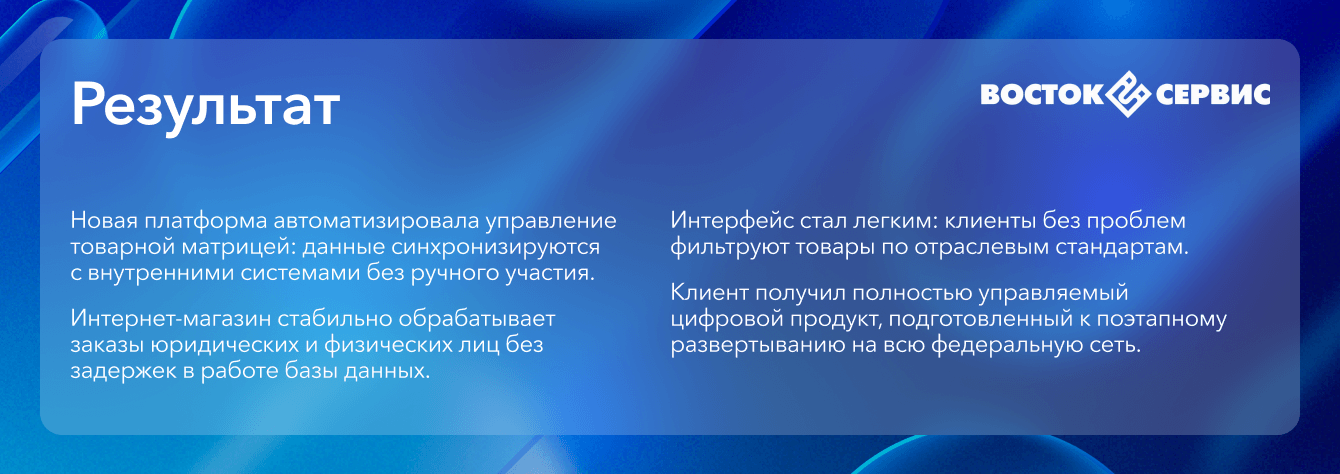 На этом проекте мы глубоко погрузились в процессы ИТ и коммерческого департамента «Восток-Сервис». Тестировали гипотезы и искали компромиссы на стыке разных систем. В итоге создали фундамент, который легко сможет масштабироваться до уровня полноценного маркетплейса.