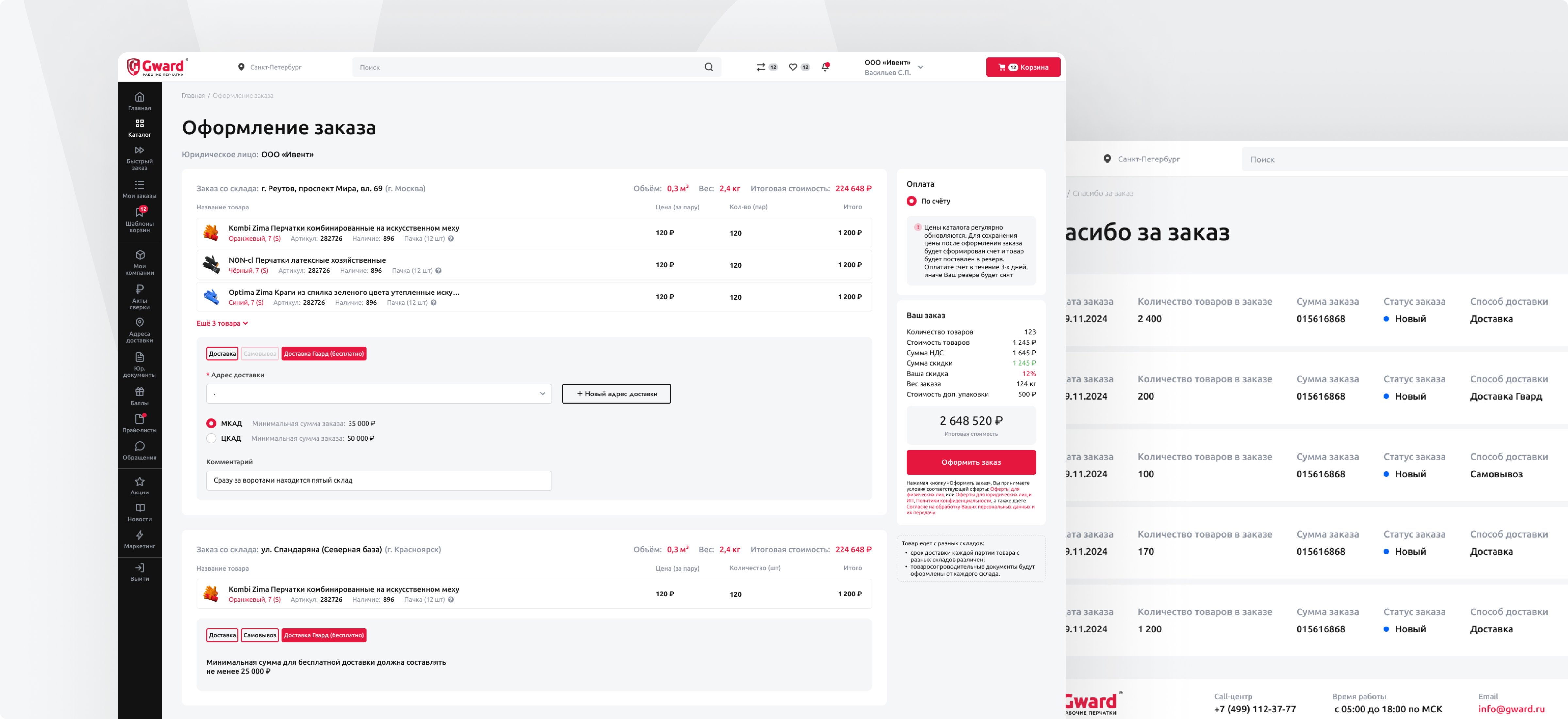 Проект начался с анализа и аудита бизнес-процессов и потребностей клиентов компании «Гвард». На этапе проектирования особое внимание было уделено удобству работы пользователей с системой, гибкости логистики и автоматизации заказов.
