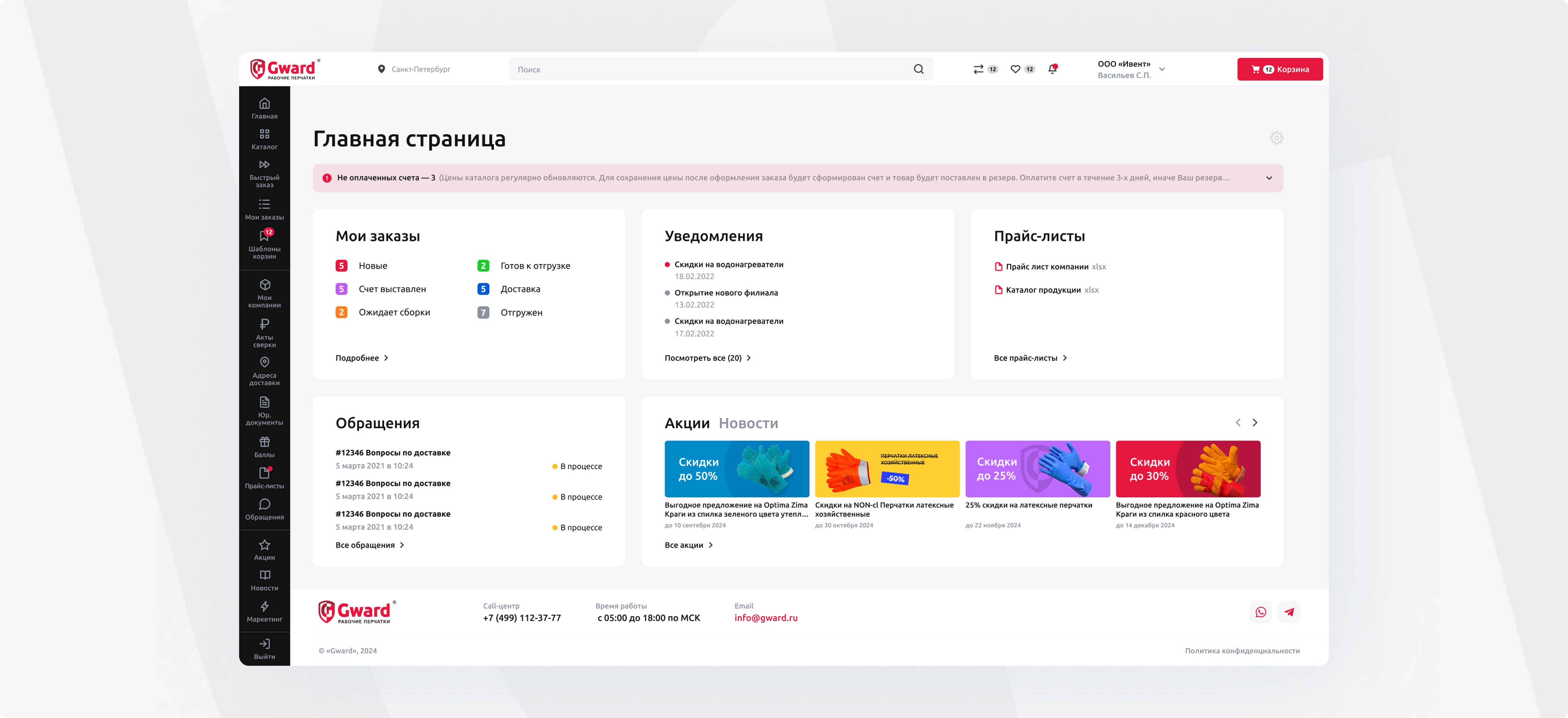 Перед компанией «Гвард» стояла масштабная задача — создать современный портал для В2В и В2С клиентов. Мы понимали, что успешная реализация проекта потребует надежного партнера с опытом разработки корпоративных порталов и гибким подходом к решению нестандартных задач. После тщательного анализа рынка мы выбрали веб-интегратора «Факт» и не ошиблись. Уже на этапе презентации команда показала высокую экспертизу и глубокое понимание нашей специфики. Сегодня новый портал позволяет клиентам компании «Гвард» получать актуальную информацию о наличии и стоимости продукции, оформлять заказы в удобном формате и планировать закупки без участия менеджеров.