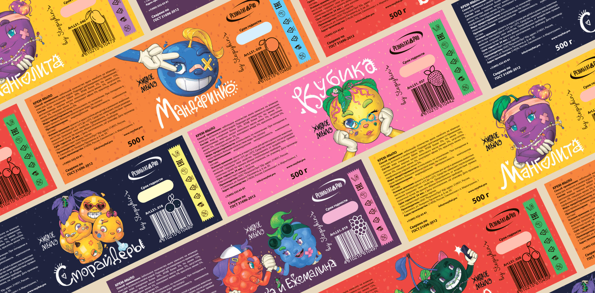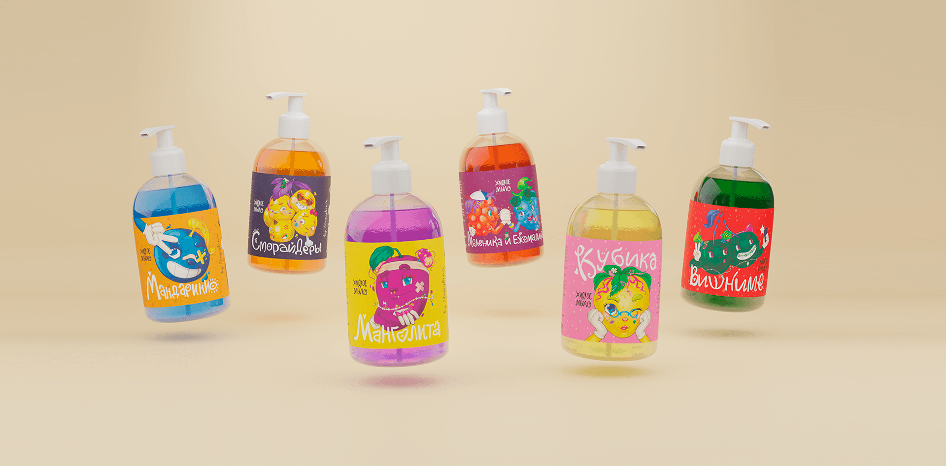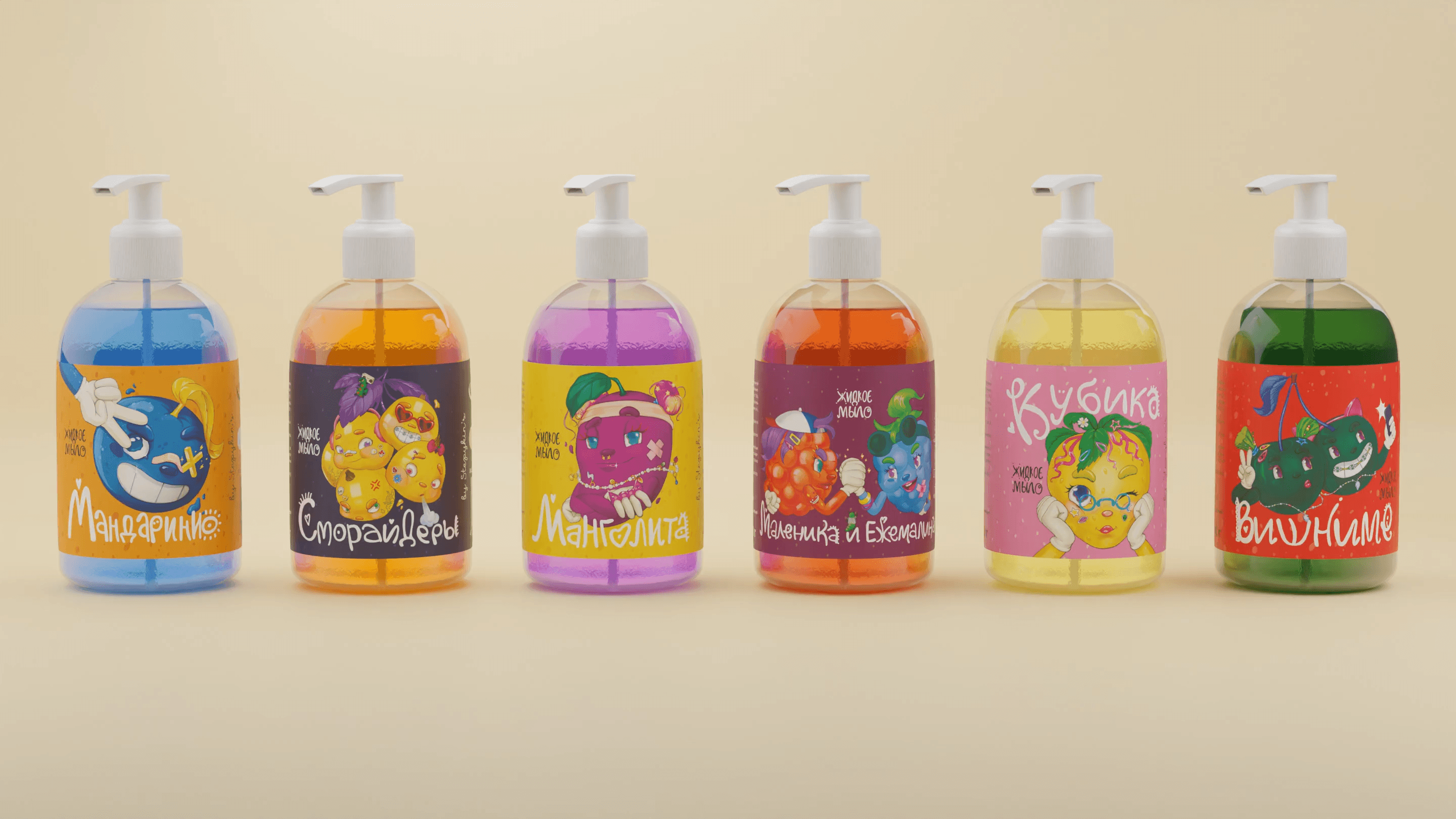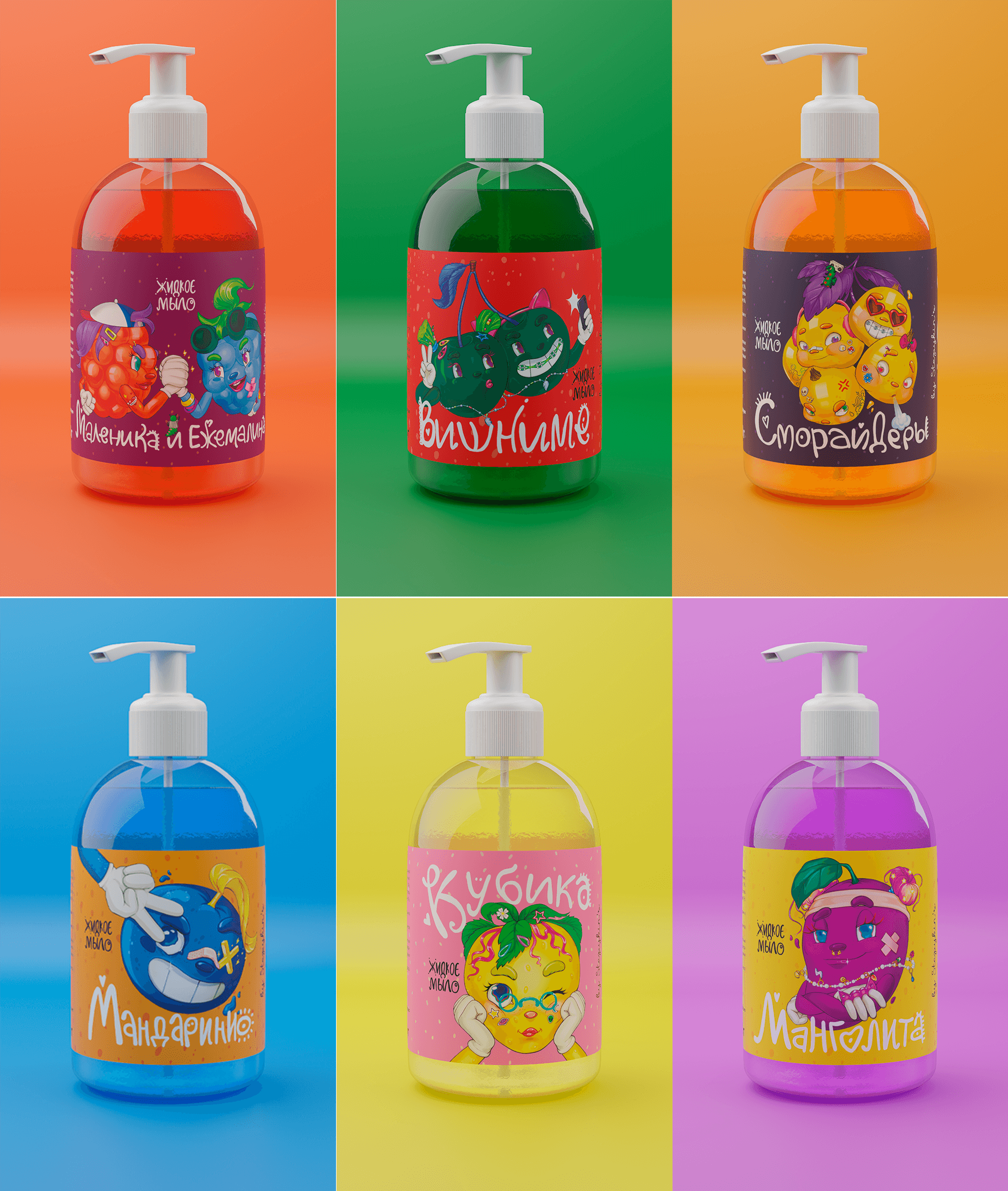 Для бренда мыла с яркими фруктовыми ароматами мы разработали серию из 6 уникальных иллюстраций — по одной для каждого запаха.