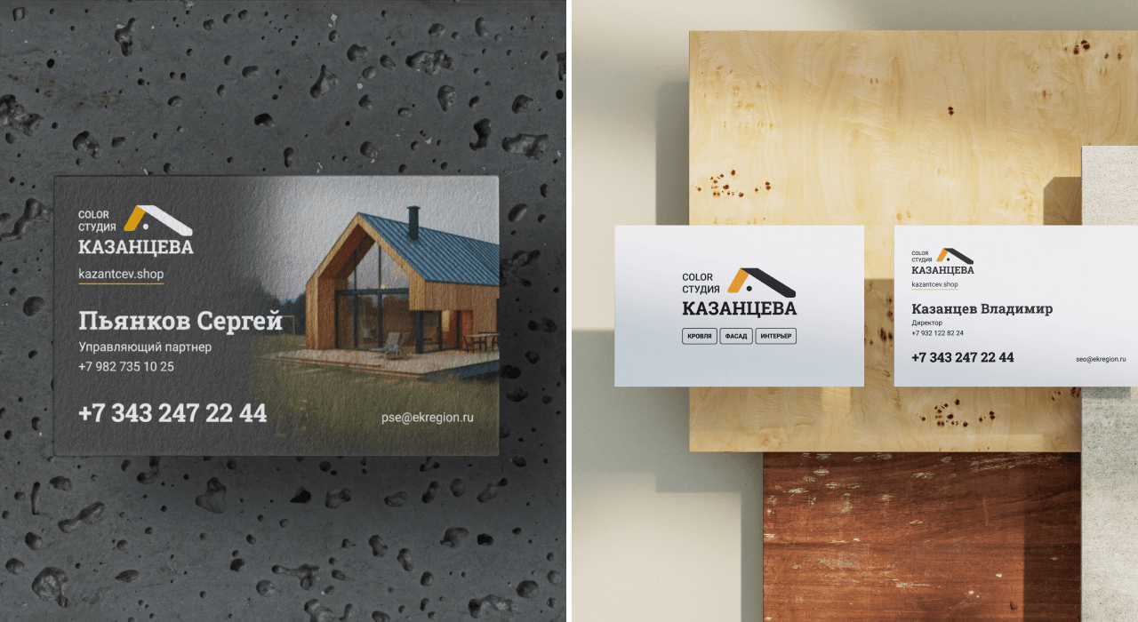Студия занимается не только продажей строительных материалов офлайн и онлайн, но и предоставляет услуги дизайна. Для подчеркивания этого мы создали два вида визиток: для сотрудников магазина — практичные и функциональные, а для руководителей — на дизайнерской бумаге с покрытием soft touch, отражающей профессионализм и высокий уровень студии.