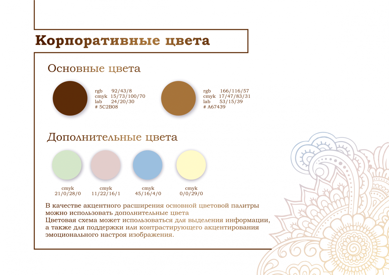 - Создать фирменный стиль, включающий: цветовая гамма, сочетающаяся с культурным символизмом (натуральные оттенки хны), графические элементы для использования в маркетинговых коммуникациях, паттерны и бесшовные орнаменты для оформления фона.