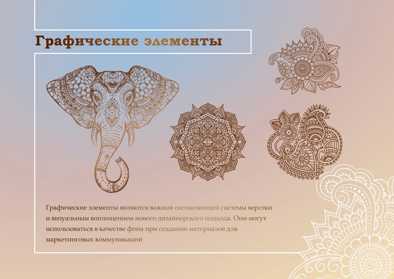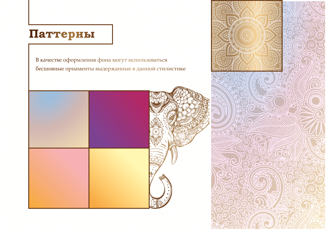В рамках ребрендинга была проведена работа по переосмыслению визуальных элементов компании. Было предложено несколько вариантов логотипа с изображением индийского слона, выполненного в разных стилях — в цветной и монохромной интерпретации. Были выделены ключевые графические элементы (мандалы и индийские орнаменты), которые могут использоваться для оформления маркетинговых материалов. Для создания фонов и акцентных элементов в рекламных материалах были предложены паттерны в спокойных натуральных оттенках.