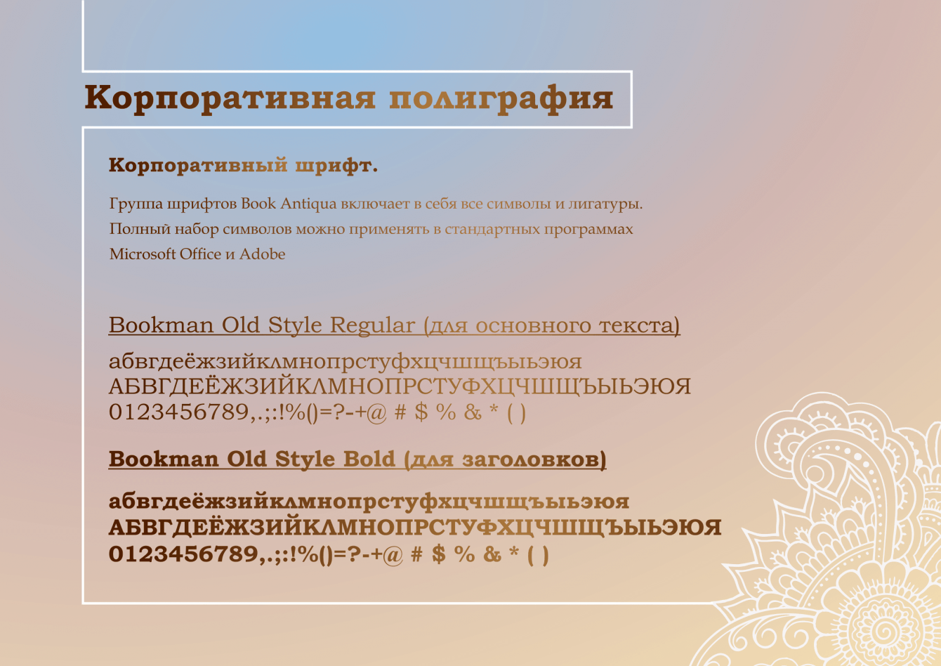 Выбор корпоративных шрифтов — Bookman Old Style Regular и Bold — был направлен на поддержку общего визуального стиля и обеспечение хорошей читаемости на любых носителях.