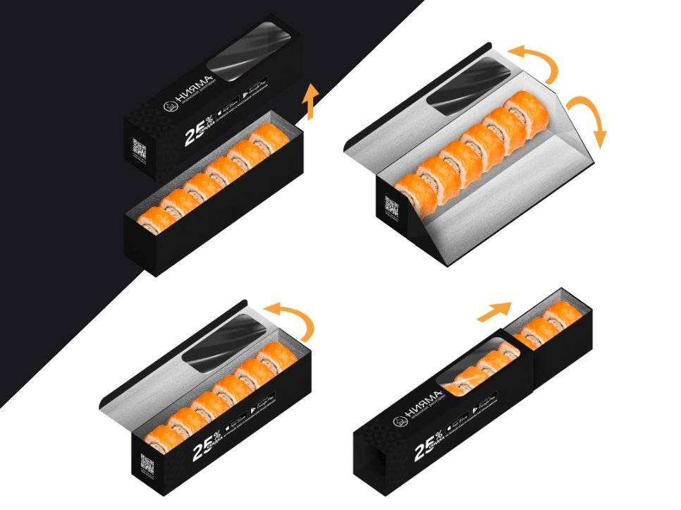 Пластиковые контейнеры для роллов и других блюд. С фирменной наклейкой на крышке и лентой, уменьшающей риск раскрытия упаковки. Вид наклейки зависит от блюда.