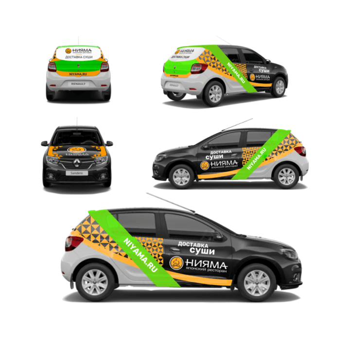 Автомобиль курьера служит дополнительным рекламным щитом для кафе. Он выделяется на дороге, привлекает внимание водителей в потоке. Элементы фирменного стиля размещены на капоте, бампере, по боковым сторонам авто.