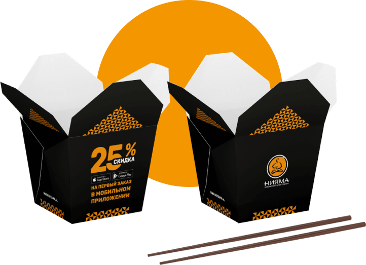 Картонная упаковка для лапши, салатов, блюд китайской и японской кухни. Выполнена в двух вариантах. Фирменные цвета присутствуют.