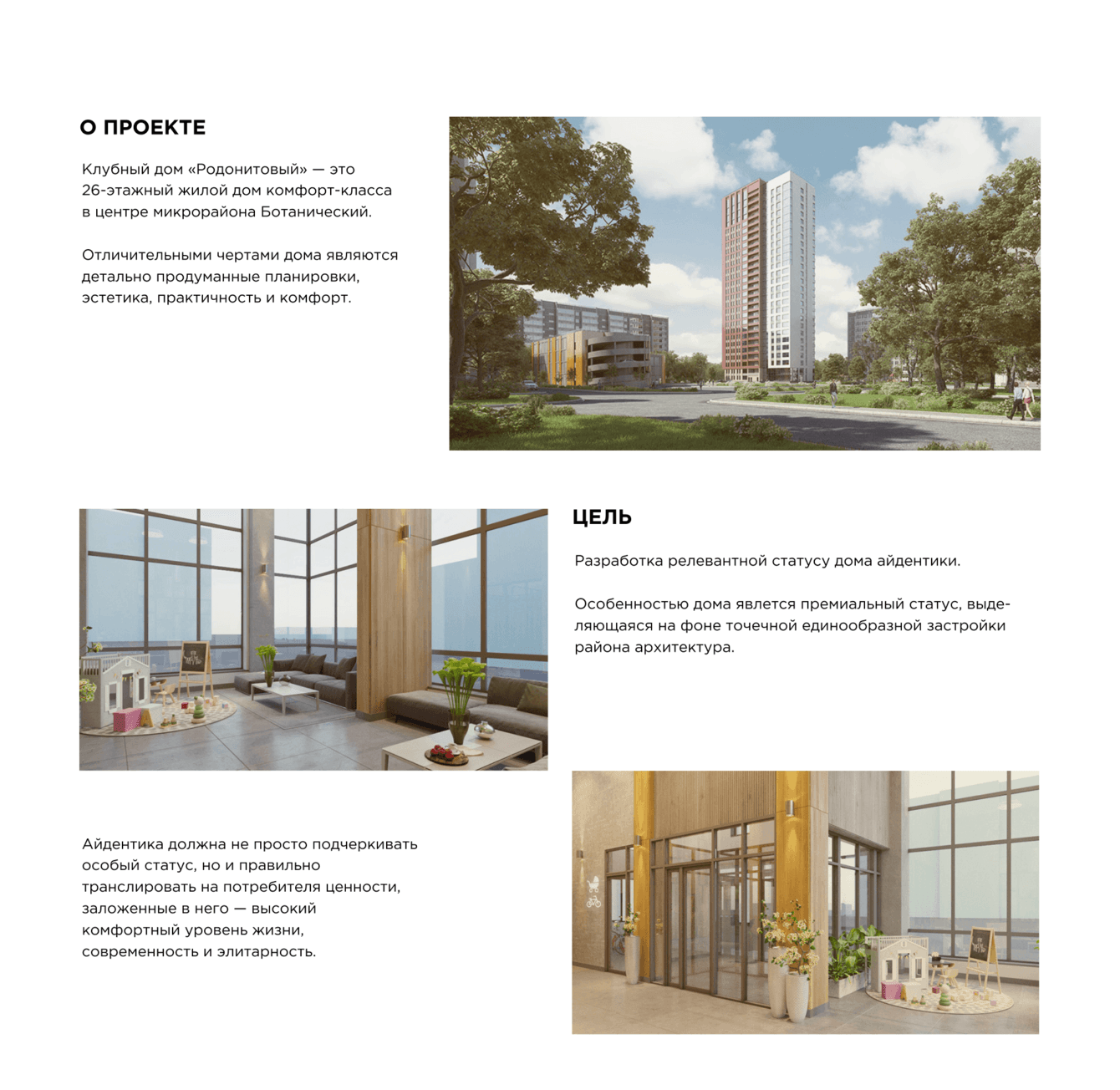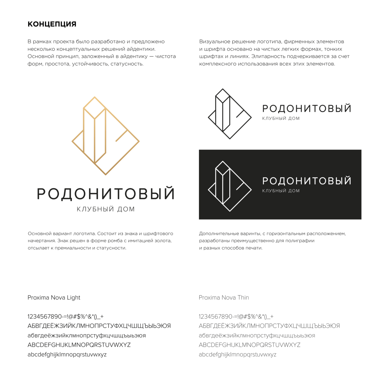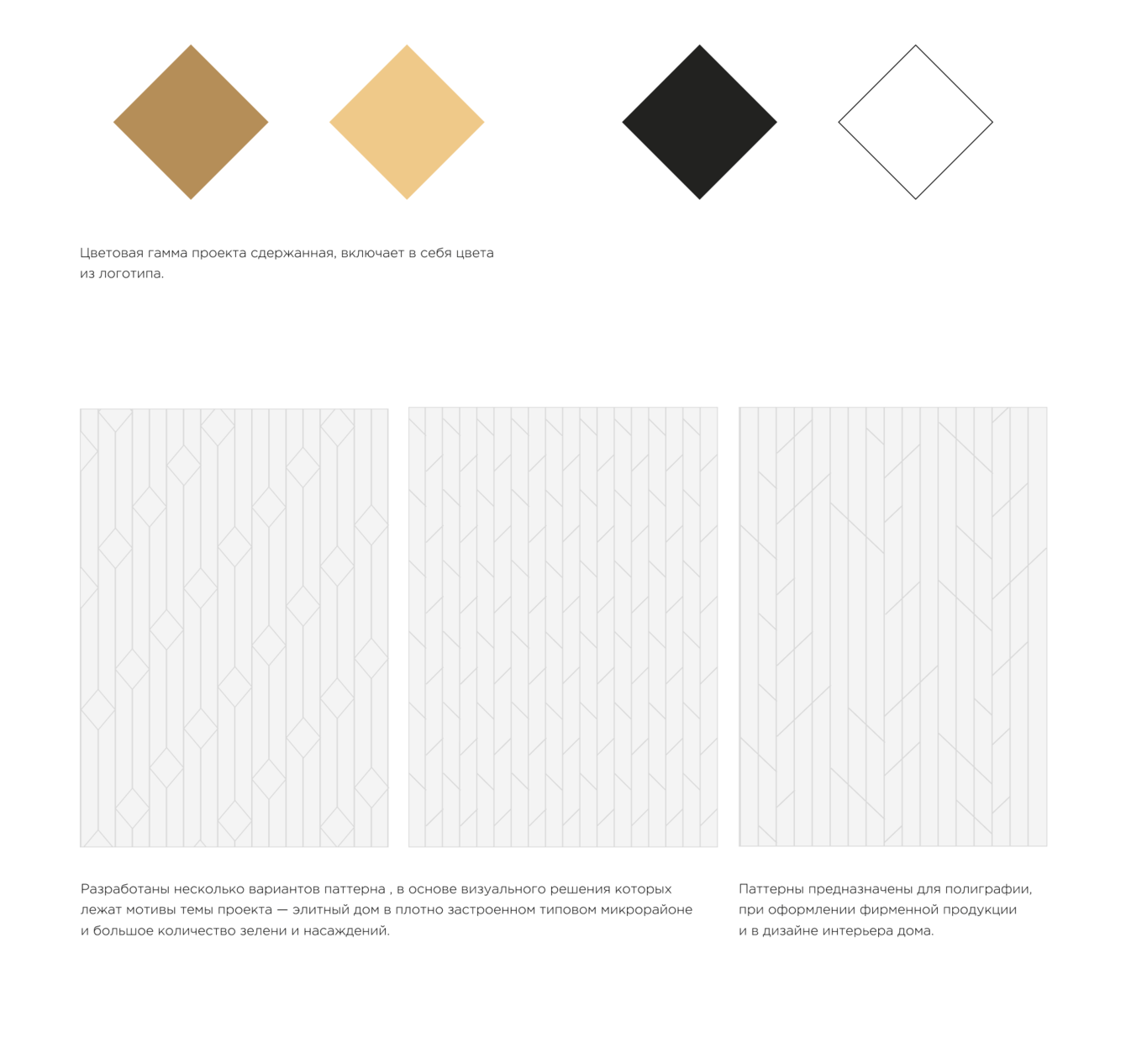 Айдентика подчеркивает премиальный статус дома и основные ценности проживания там — высокий уровень комфорта, современность, престиж. В рамках проекта разработано два концептуальных решения. Основной принцип — аккуратность и читаемость начертаний, статусность. Визуальное решение основано на чистых легких формах, тонких шрифтах и линиях. В сочетании все эти элементы рисуют образ стильного, современного клубного дома.