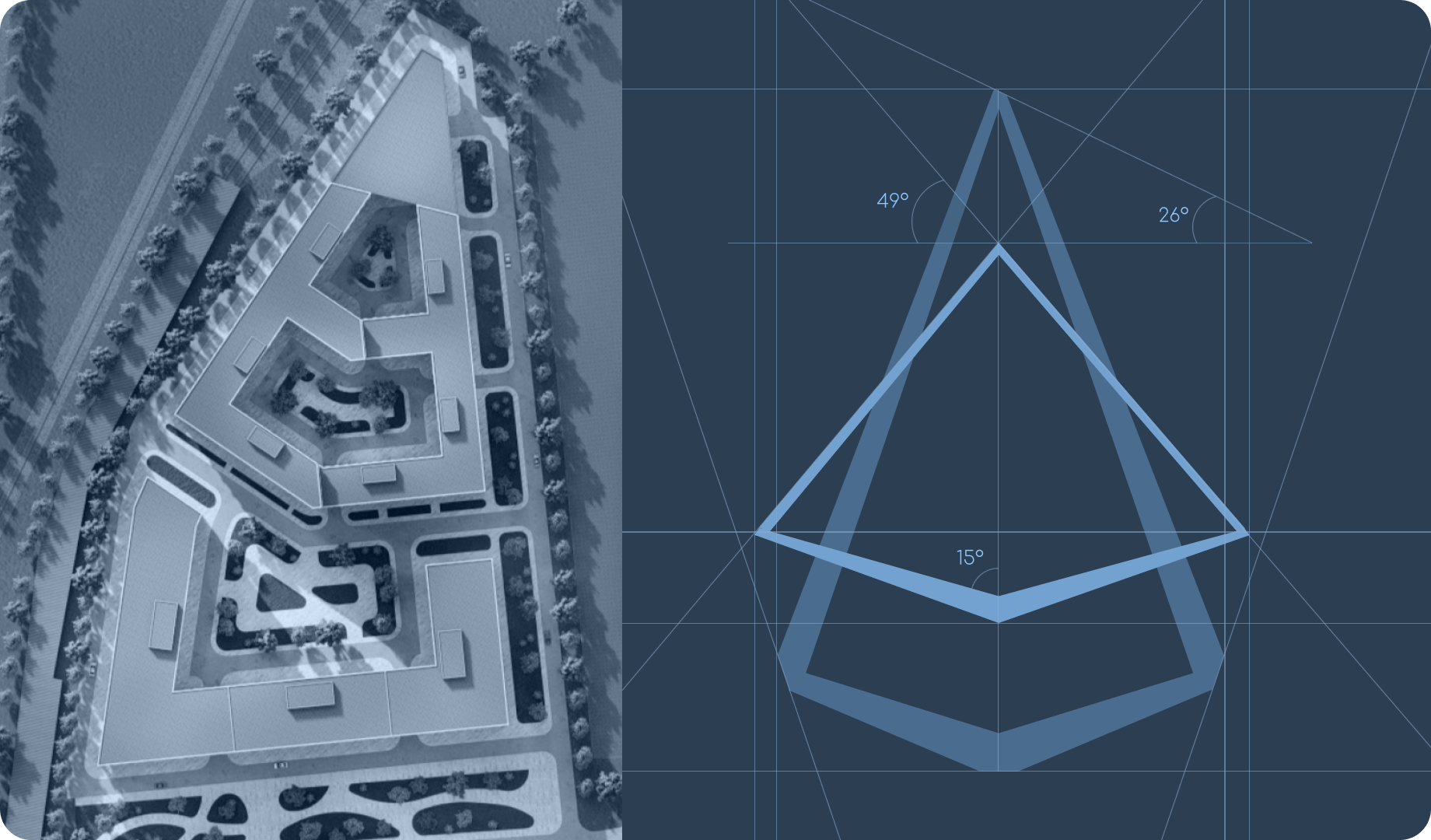 Работа над логотипом началась с глубокого погружения в особенности технопарка. Мы изучили проектные рендеры, посмотрели съёмки территории сверху и заметили уникальные очертания зданий. Именно форма застройки вдохновила нас на создание логотипа.