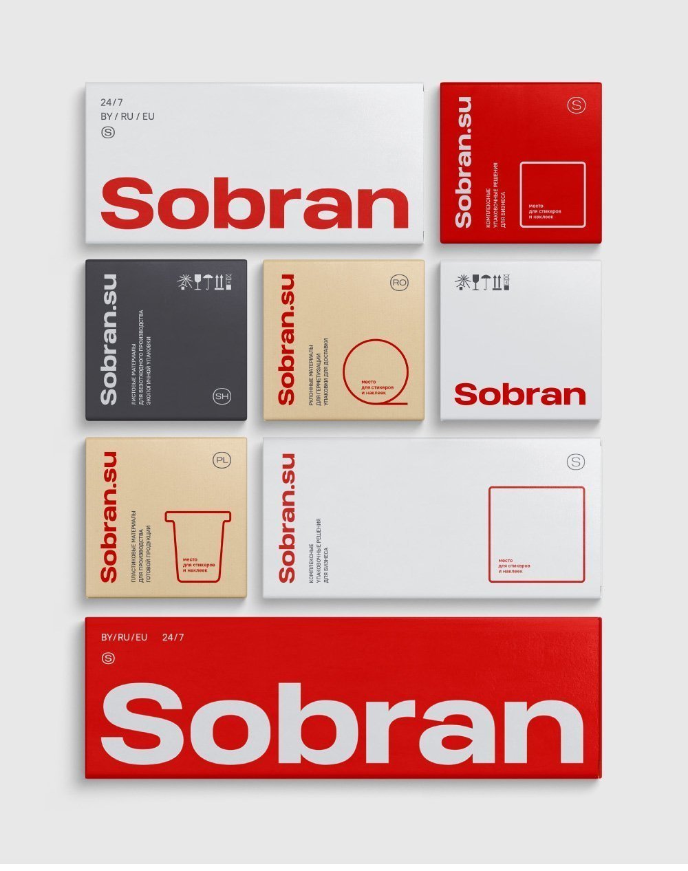 "Sobran" - это международный бренд, который предоставляет своим клиентам широкий ассортимент упаковочной продукции и эффективных упаковочных решений. Все решения и товары доступны по оптимальным ценам с высоким уровнем удобства изучения и приобретения ассортимента. Для проекта был разработан нейминг и концептуально/структурно проработанный фирменный стиль в рамках корпоративных, упаковочных, имиджевых и веб-решений: разработка адаптивной системы типографики и верстки, лого, контурный концепт-дизайн, конструктор упаковки, концепт-дизайн интерьеров/экстерьеров, дизайн фирменной и имиджевой продукции, а также оформление соцсетей и концептирование десктопной версии интернет-магазина.