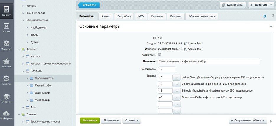 Тарифы могут быть сложными, включать разный тип товаров и их количество, поэтому каждая позиция добавляется как отдельный элемент. В настройках элемента из каталога выбираются товары, которые участвуют в тарифе.