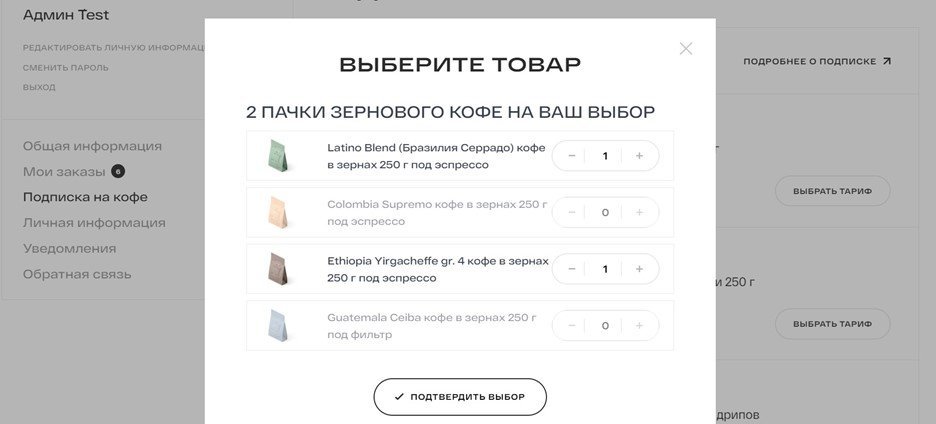 В ходе работы был создан блок регулярной подписки на товары с возможностью выбора тарифов и товаров в них. Выполнена возможность настройки выбора позиций кофе в тарифе, в определённом количестве.