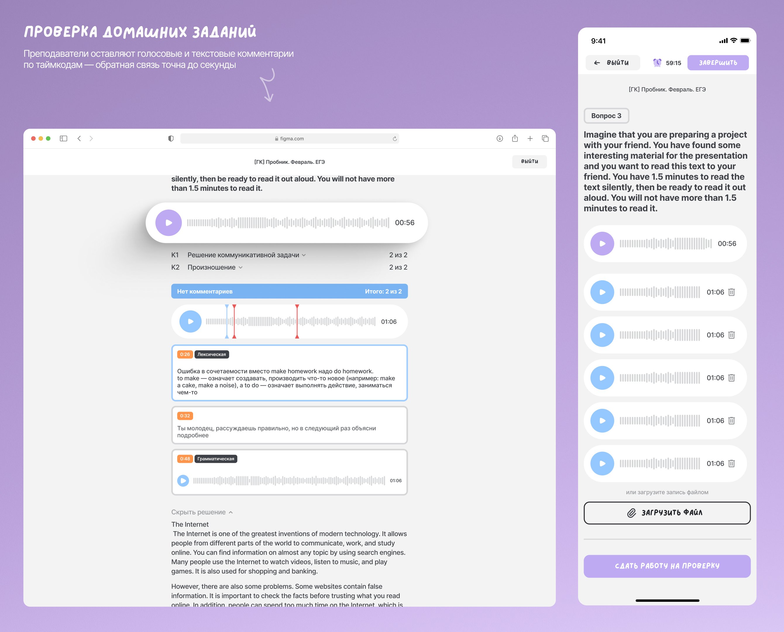 Проверка домашних заданий разделена по типам работы. Первая часть ОГЭ и ЕГЭ тестовая и проверяется автоматически, вторая и сочинения — вручную. Куратор размечает ответы прямо в тексте: подсвечивает ошибку, оставляет развернутый комментарий, предлагает пример решения. Для голосовых задач, например для говорения на английском, доступна по секундная навигация — куратор оставляет пометки на таймкод, где была сделана ошибка, и ученик перескакивает к нужному фрагменту одним кликом. Так обратная связь получается не формальной, а по-настоящему прикладной.