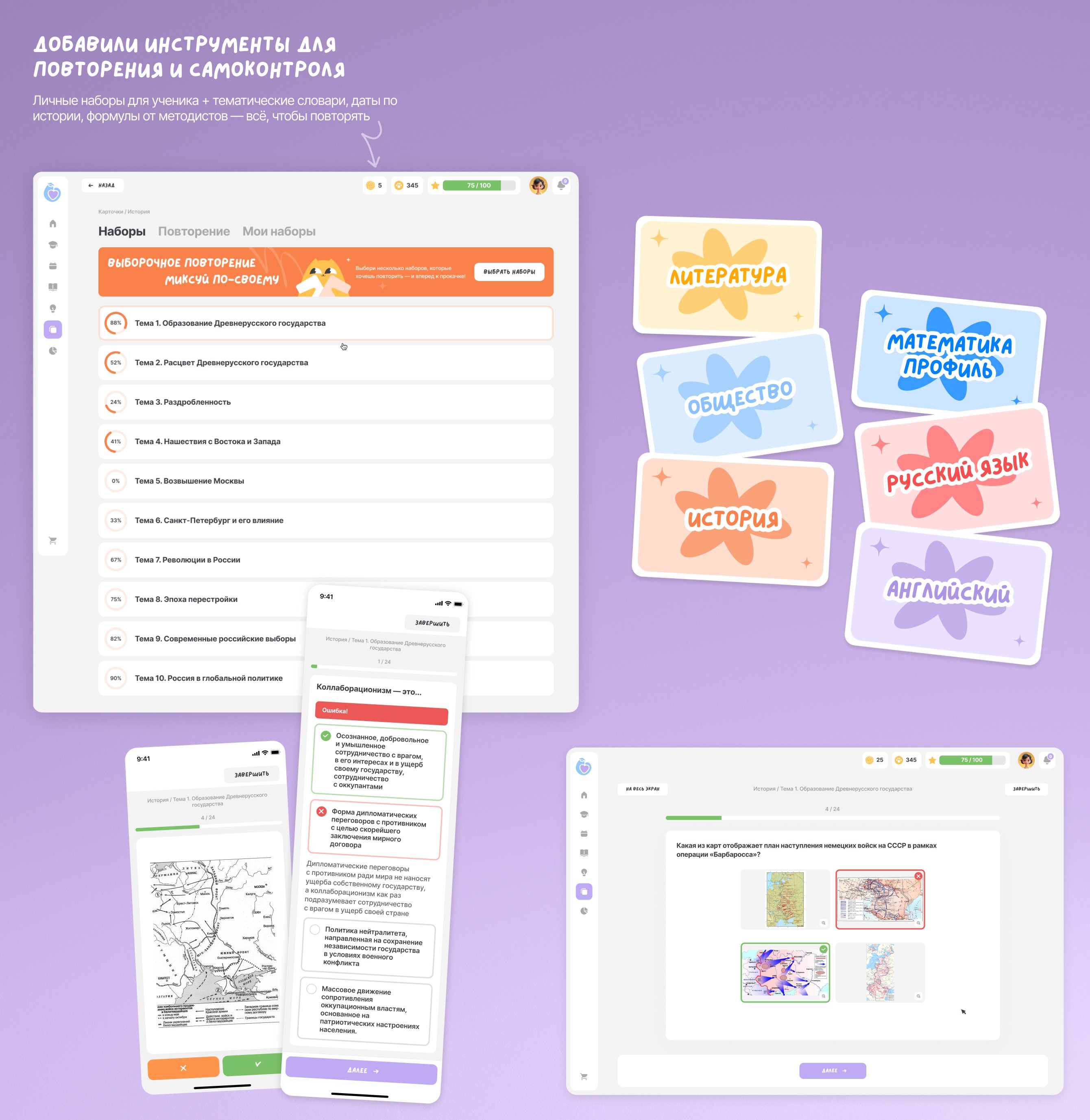 Для повторения тем в платформу встроили карточки по логике. Функционал похож на Quizlet: быстрые повторения «знаю/не знаю», прогресс по наборам и интервальные напоминания «вернись к теме через N дней». Личные наборы для ученика + тематические словари, даты по истории, формулы от методистов — всё, чтобы повторять. А еще можно самостоятельно создать набор карточек и включить туда любые темы, слова, даты, которые сложно запоминаются, это полезно для подготовки к экзаменам.