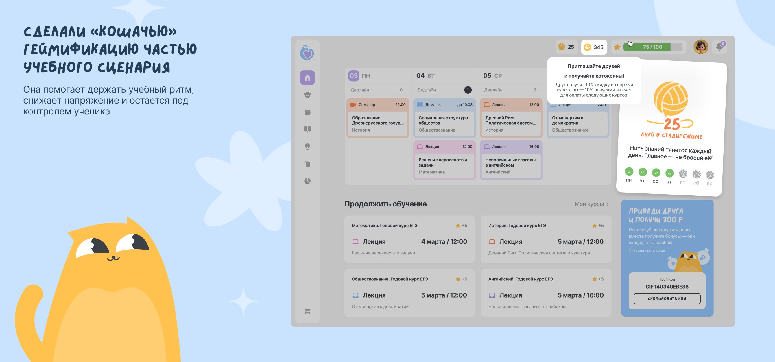 В интерфейсе платформы есть кот-маскот — он появляется в моменты, когда нужно поддержать ученика и помочь ему сохранять ритм занятий, поднять настроние. Например, если пользователь регулярно занимается, маскот сопровождает этот прогресс внутри продукта. Питомца можно полностью выключить в настройках. Отдельно в разработке находится механика с «живым» перетаскиванием: маскота можно двигать мышкой, после чего он исчезает до следующего появления.