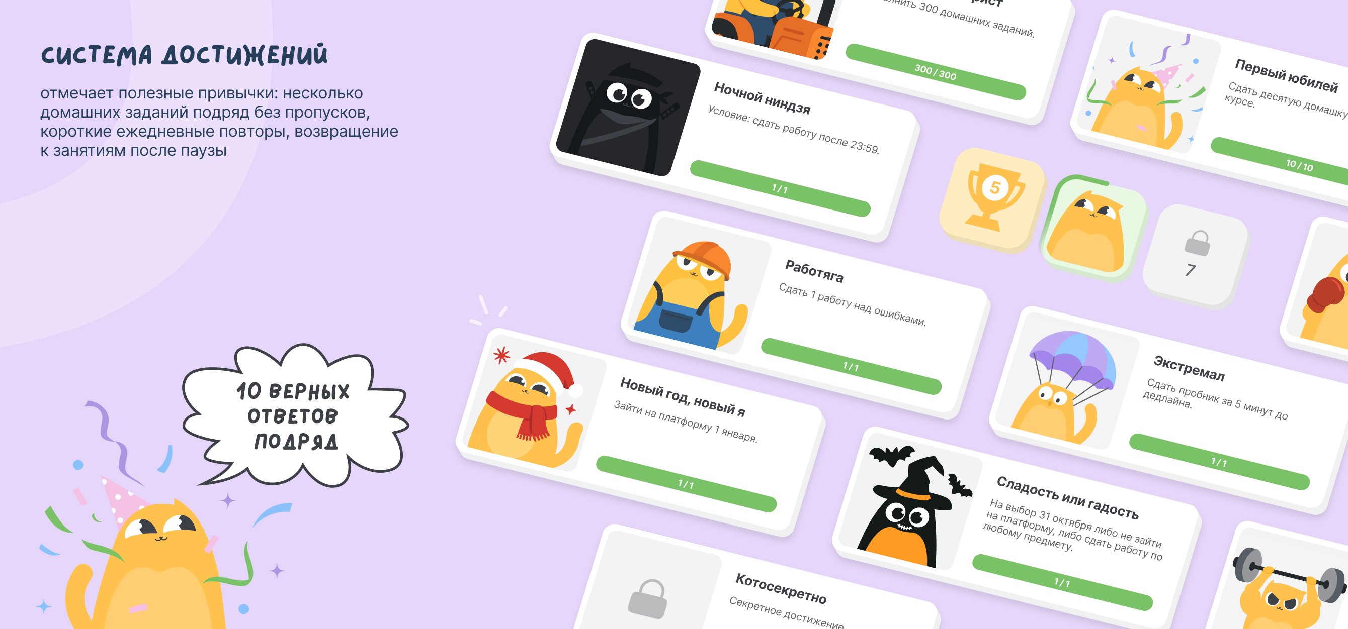 Система достижений отмечает полезные привычки: несколько домашних заданий подряд без пропусков, короткие ежедневные повторы, возвращение к занятиям после паузы. Есть и отдельный «ночной» сценарий для тех, кто заходит после 22:00 и успевает выполнить задания. При этом в платформе нет рейтингов и соревнования между учениками — только личная статистика.