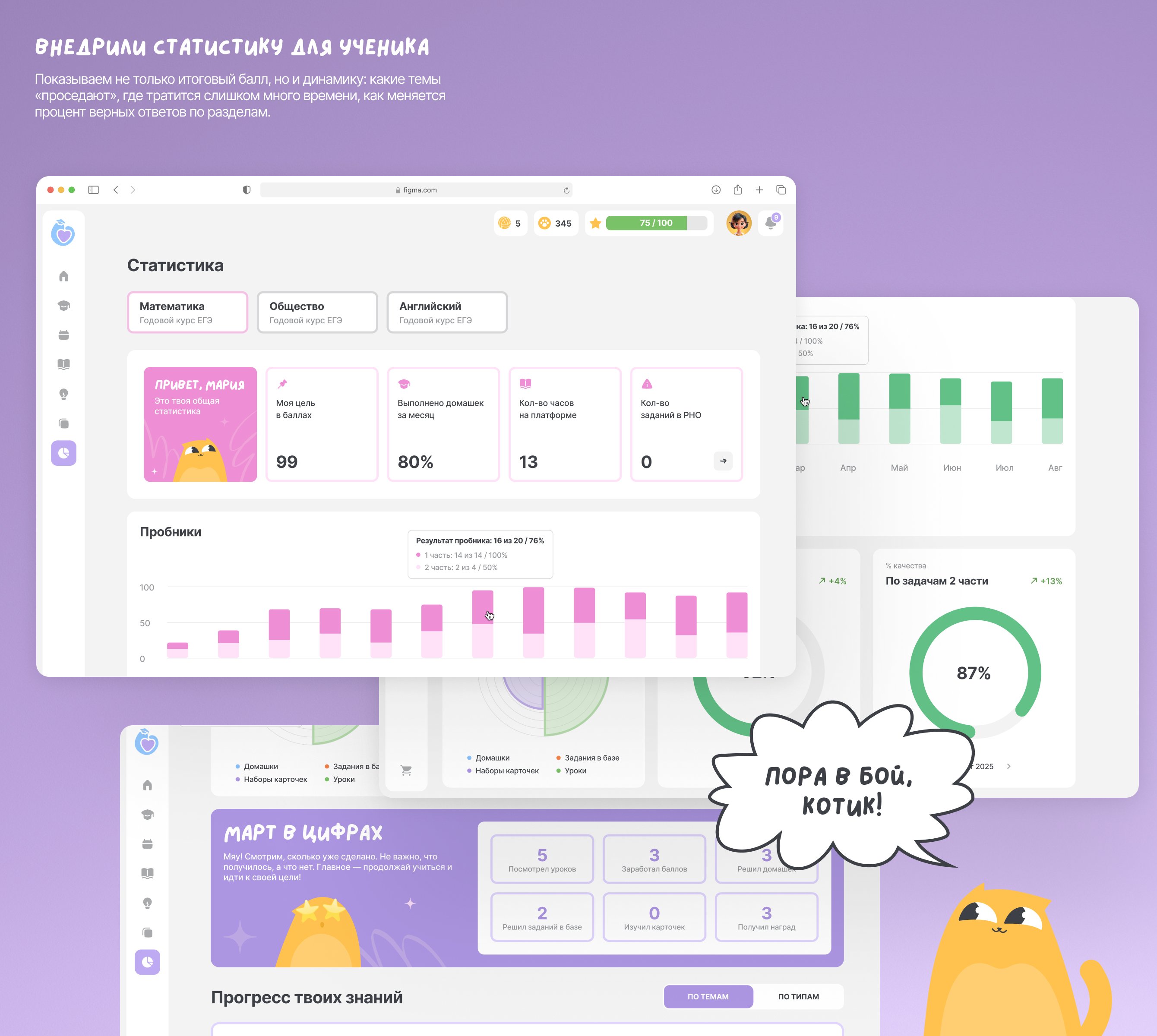 Для клиента разработали платформу подготовки к ЕГЭ и ОГЭ, где учебный процесс сочетается с «кошачьей» геймификацией: в интерфейсе используются коты-маскоты, которые сопровождают ученика в разных учебных сценариях. Игровые механики встроили не как декоративный слой, а как часть учебного ритма — чтобы снизить напряжение, поддерживать регулярность и не превращать подготовку в еще один источник стресса.