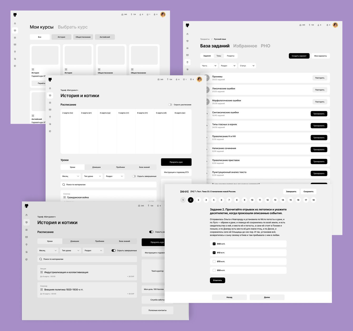 До запуска «Стадикэтс» предметы и учебные инструменты у клиента существовали разрозненно. Нужно было собрать их на одной платформе с общей админкой, чтобы выстроить сквозные процессы, упростить управление контентом и получить общую аналитику. На старте проект прошел через несколько плотных бриф-сессий: заказчик подготовил большую Miro-доску с обязательными элементами и примерами конкурентов, а команда Qtim — варфреймы и первые кликабельные макеты.