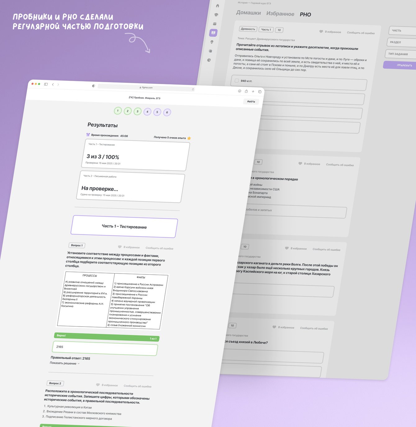 Клиент получил единую платформу подготовки к ЕГЭ и ОГЭ, в которой собраны ключевые сценарии для учеников и команды: покупка курсов, расписание, домашние задания, пробники, карточки для повторения, статистика, банк заданий и система проверки.