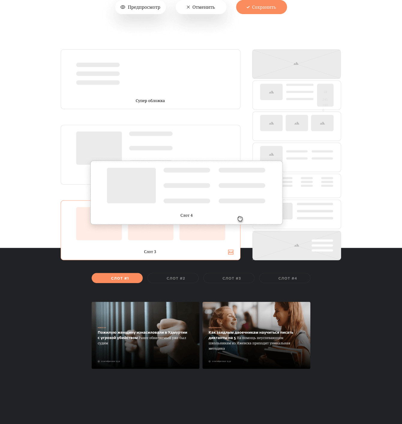 Администратор сайта может формировать уникальную главную страницу, выводить неограниченное количество каждого типа слотов. Перед публикацией убедиться в корректности отображении страницы использую «Предпросмотр»