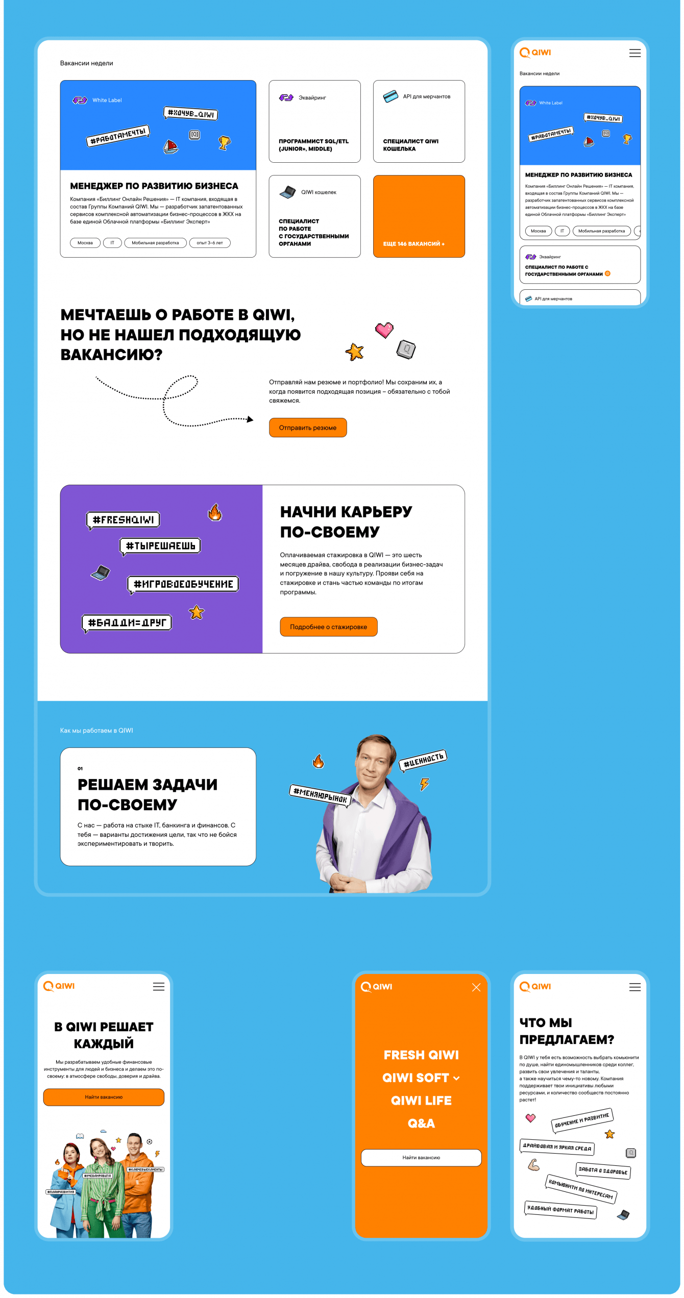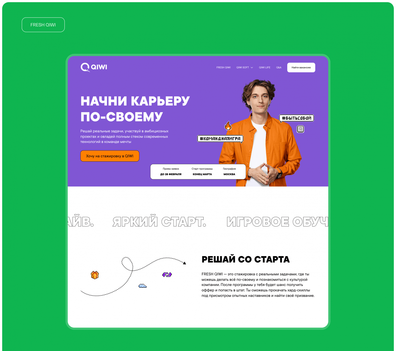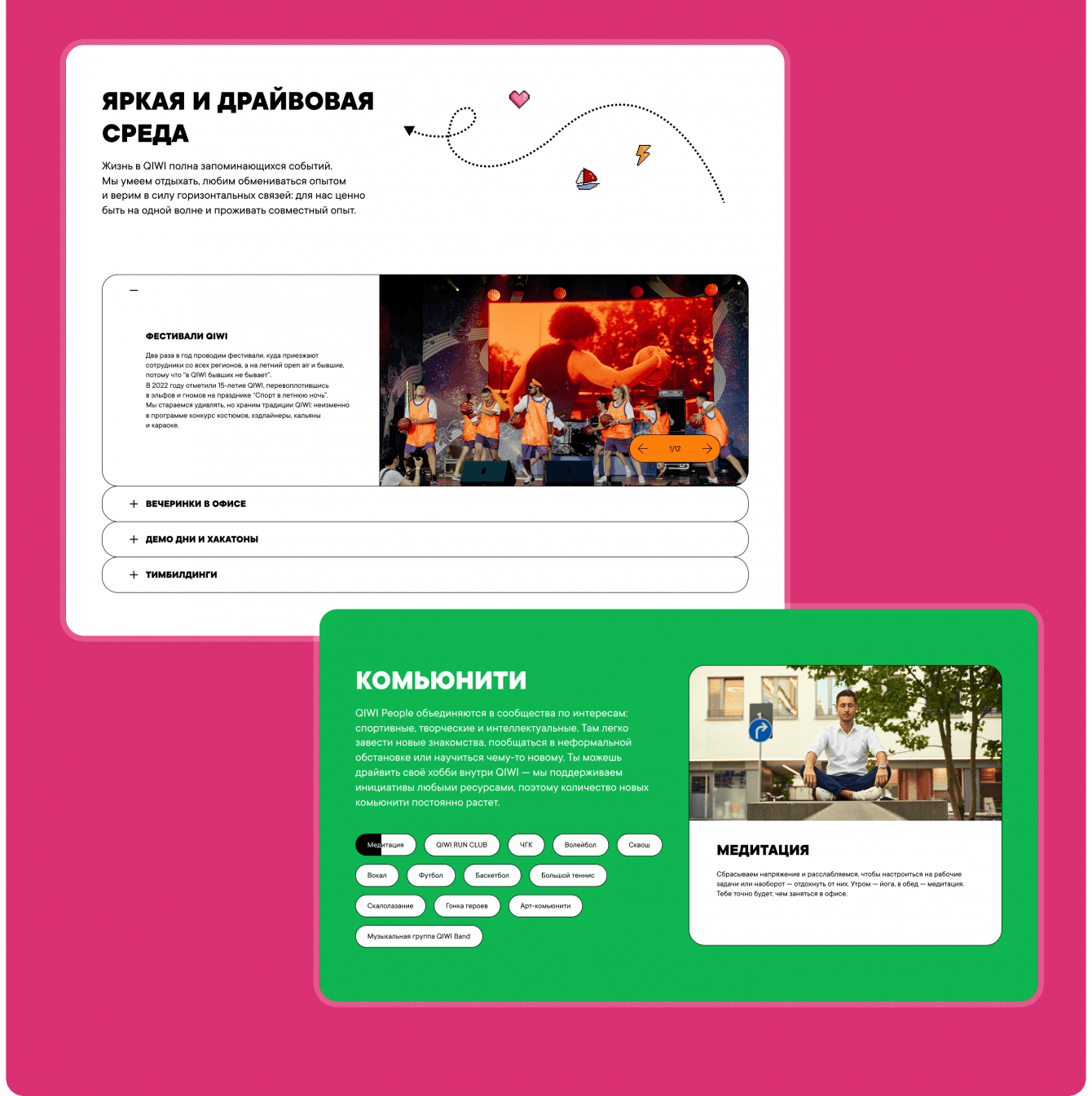 Нам нужно было создать корпоративный hr-портал с вакансиями, погружением в корпоративную культуру с внутренними комьюнити и активностями, анонсами программ стажировок и обучающей платформы. Глобально показать внутреннюю кухню qiwi и привлечь соискателей, а также выделиться среди конкурентов.