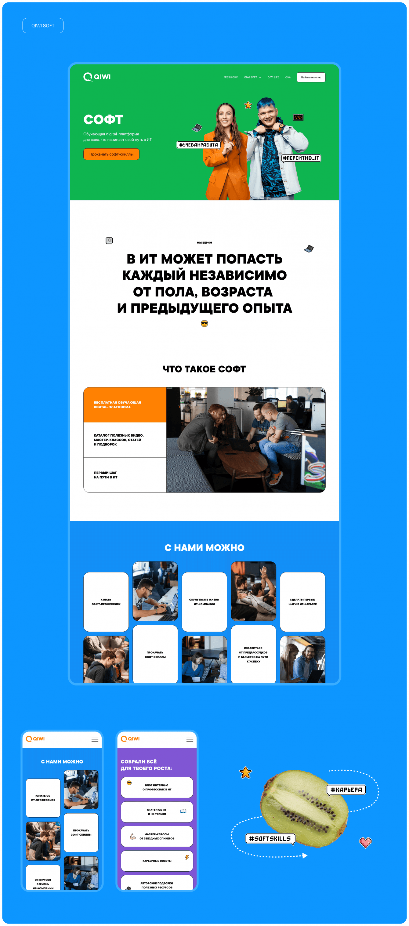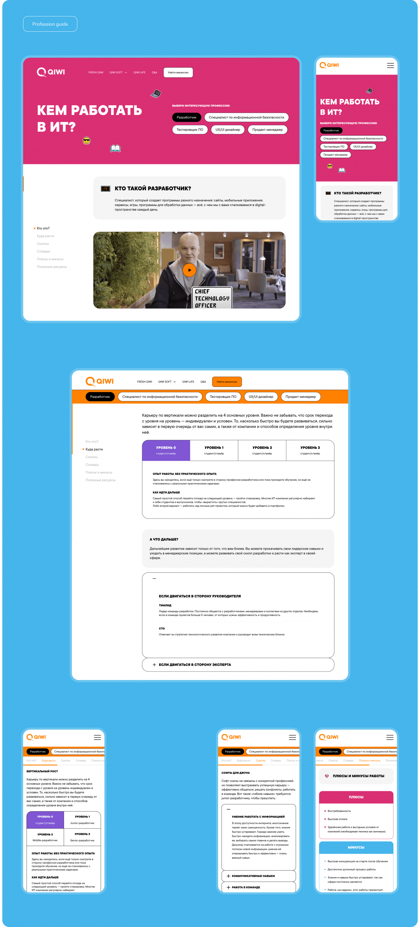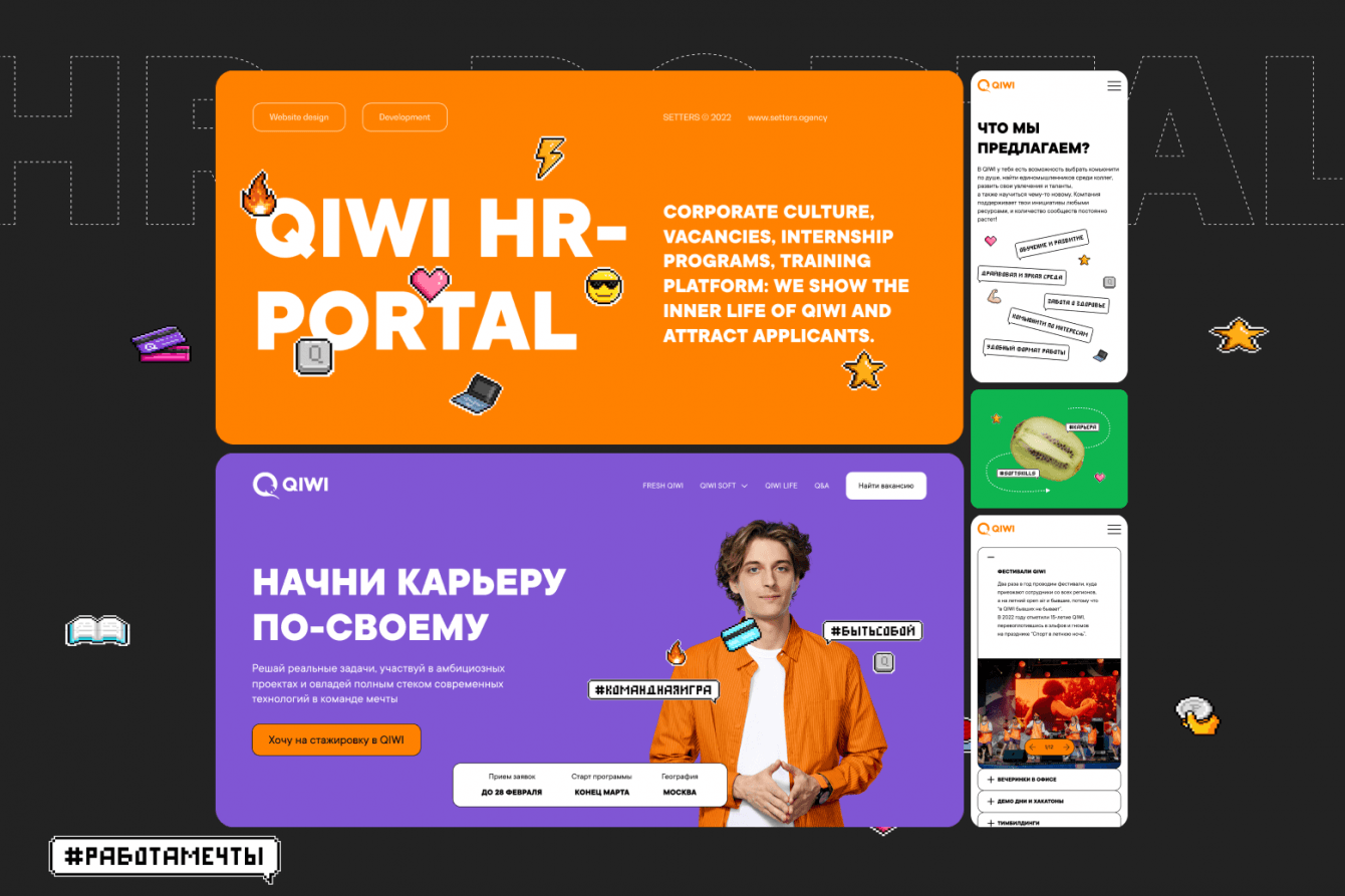 Нам нужно было создать корпоративный hr-портал с вакансиями, погружением в корпоративную культуру с внутренними комьюнити и активностями, анонсами программ стажировок и обучающей платформы. Глобально показать внутреннюю кухню qiwi и привлечь соискателей, а также выделиться среди конкурентов.