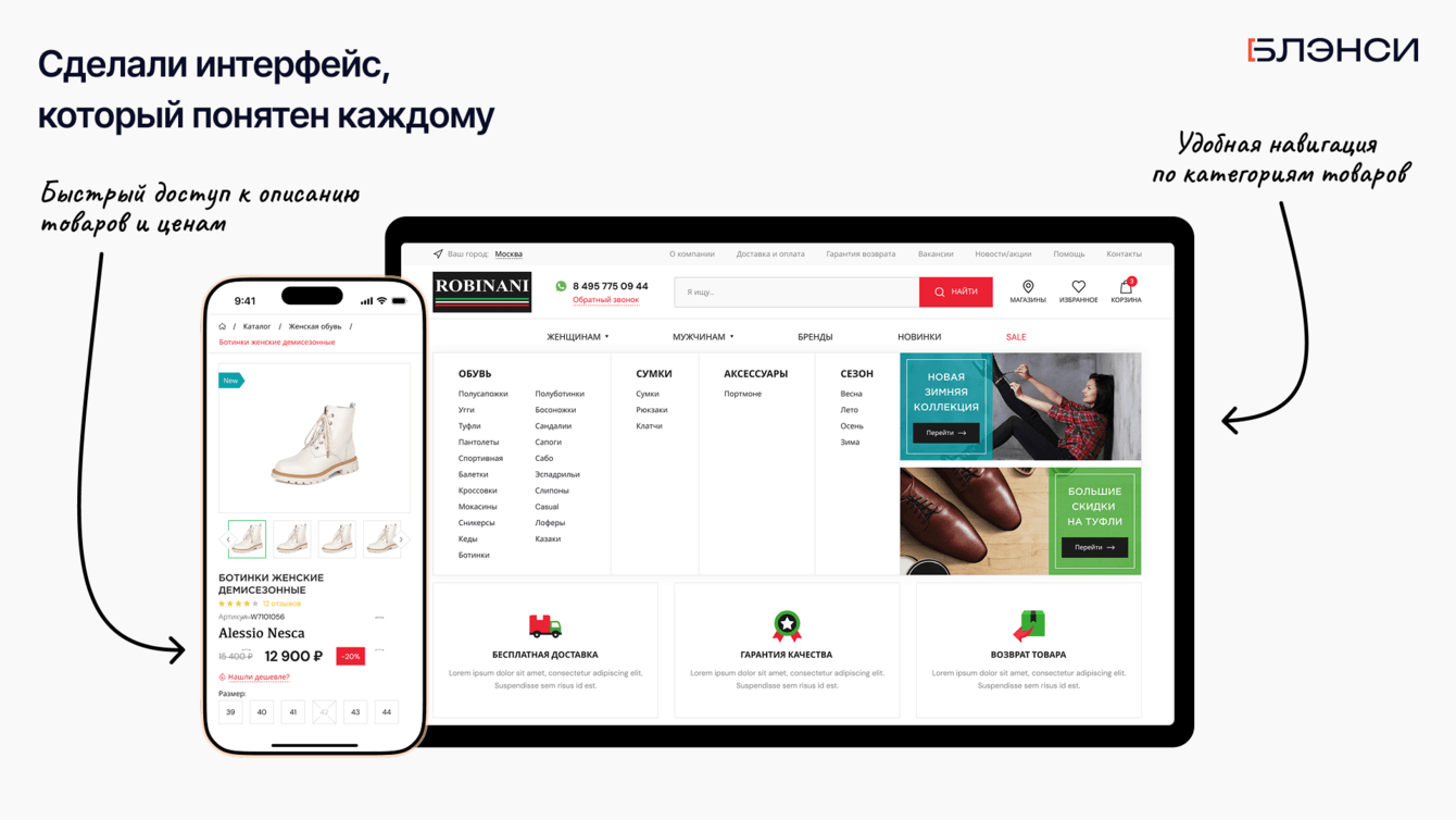 Таким образом, интернет-магазин «Robinani» не только выделяется на фоне конкурентов, но и уверенно укрепляет репутацию бренда, ориентированного на качество, стиль и полностью соответствуя современным стандартам цифрового рынка!