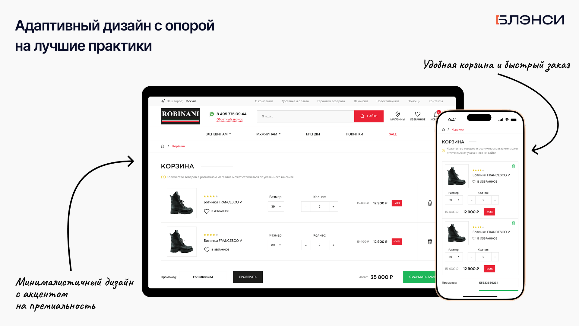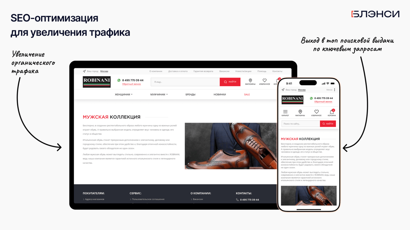 Таким образом, интернет-магазин «Robinani» не только выделяется на фоне конкурентов, но и уверенно укрепляет репутацию бренда, ориентированного на качество, стиль и полностью соответствуя современным стандартам цифрового рынка!