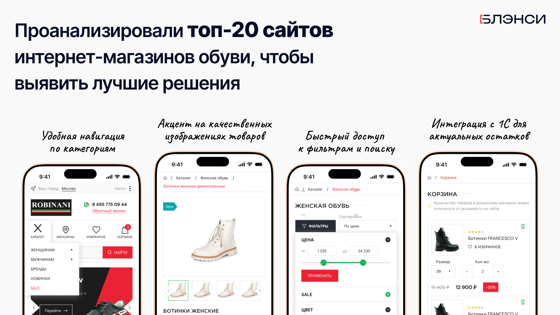 Проанализировав топ-20 конкурирующих сайтов обувных интернет-магазинов, наша команда определила важные решения для реализации собственного проекта: