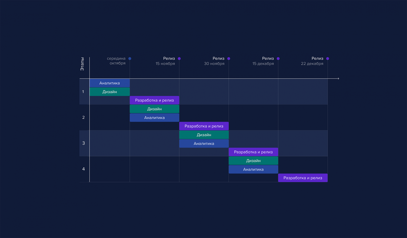 Релизное планирование и параллельные работы по аналитике, дизайну и разработке помогли нам ускорить работу над проектом. Отрисованные и согласованные макеты мы передавали в разработку и готовили первый релиз. Параллельно отрисовывали состав следующего релиза и передавали его в разработку.
