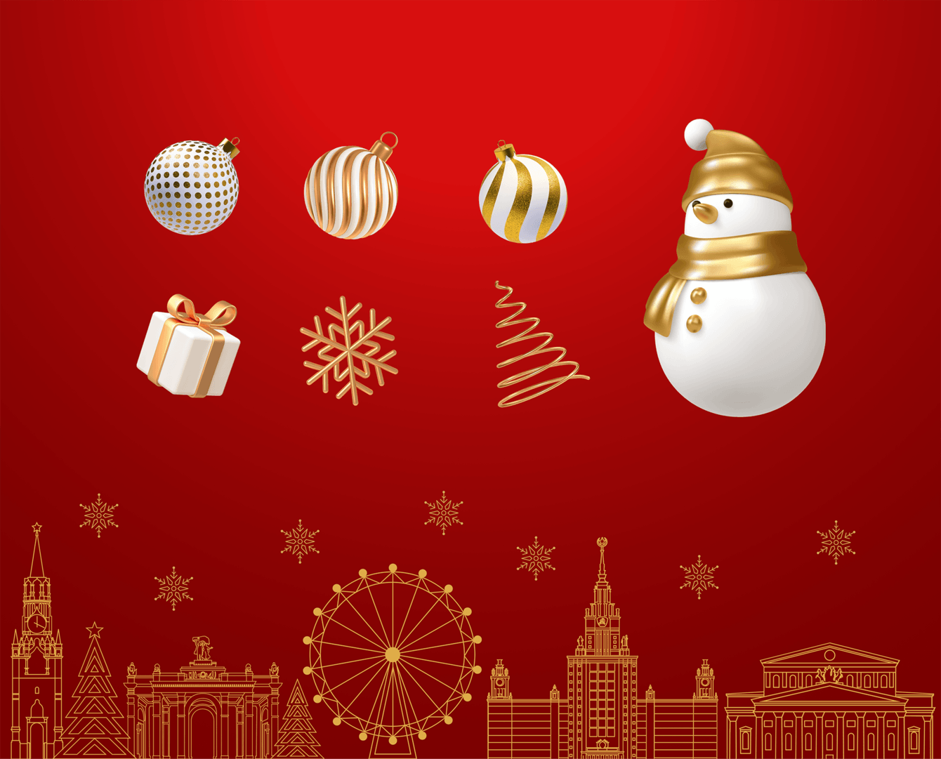Поддержали новогоднюю тему золотыми игрушками и снежинками. В проекте использовалась как 3D-графика для крупных объектов, так и вектор.