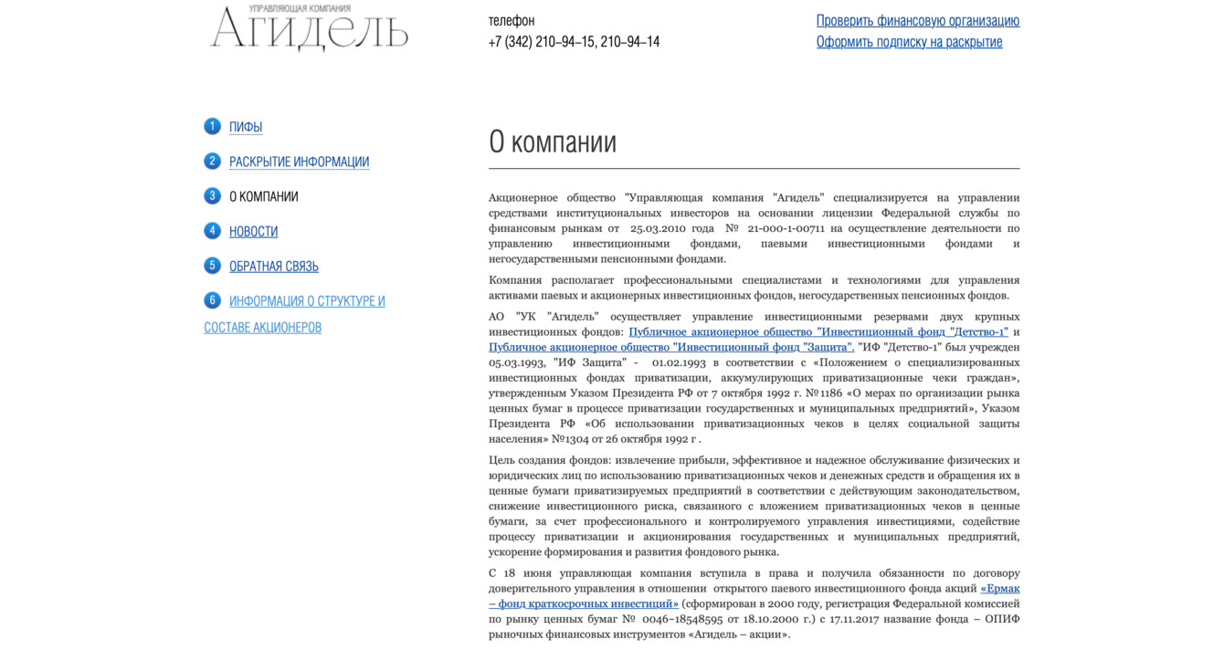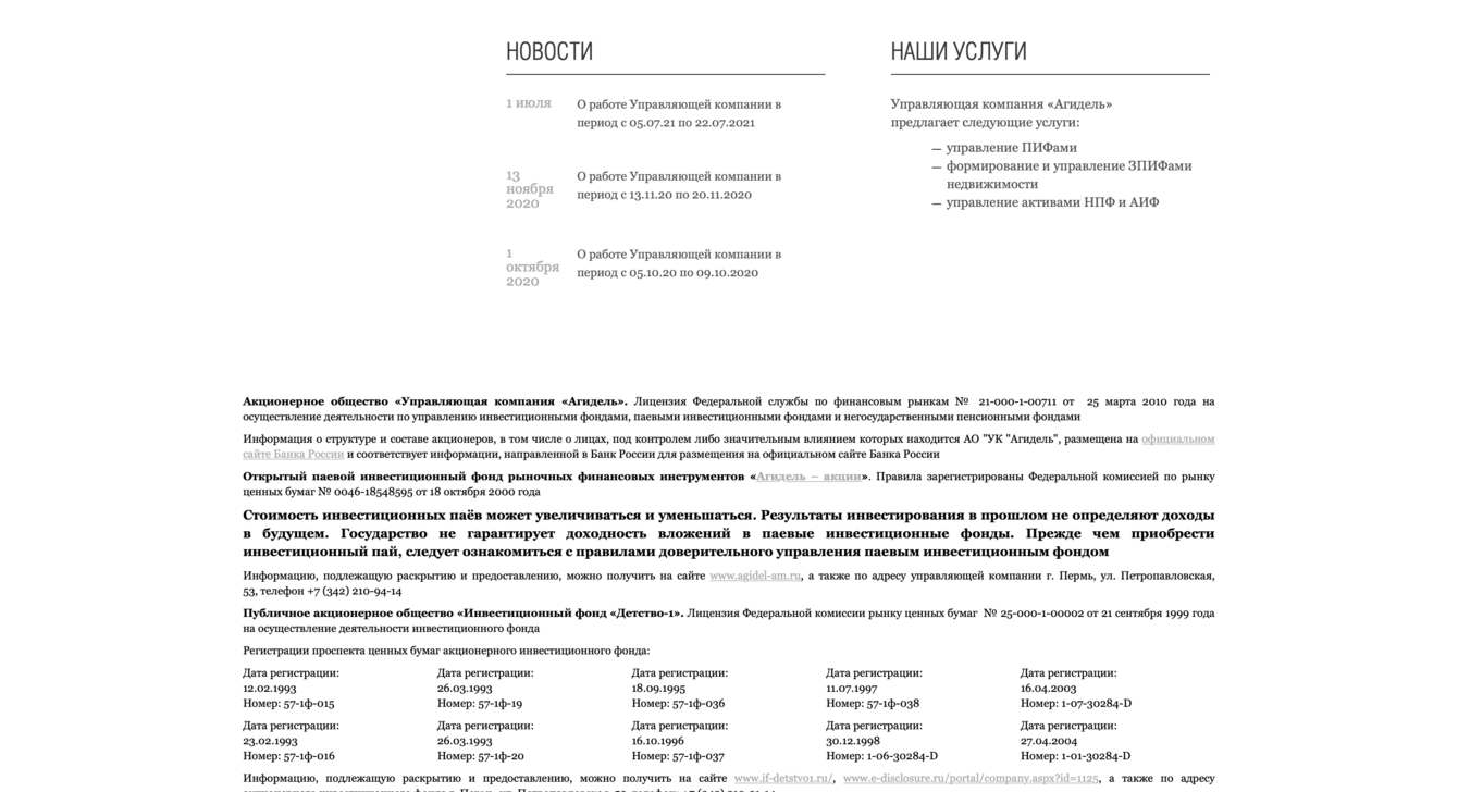 АО «Агидель» занимается управлением средствами институциональных инвесторов. Компания обратилась к нам за разработкой нового сайта. Онлайн-представительство «Агидель» должно вмещать информацию о работе компании, акционерах и продаже паев.