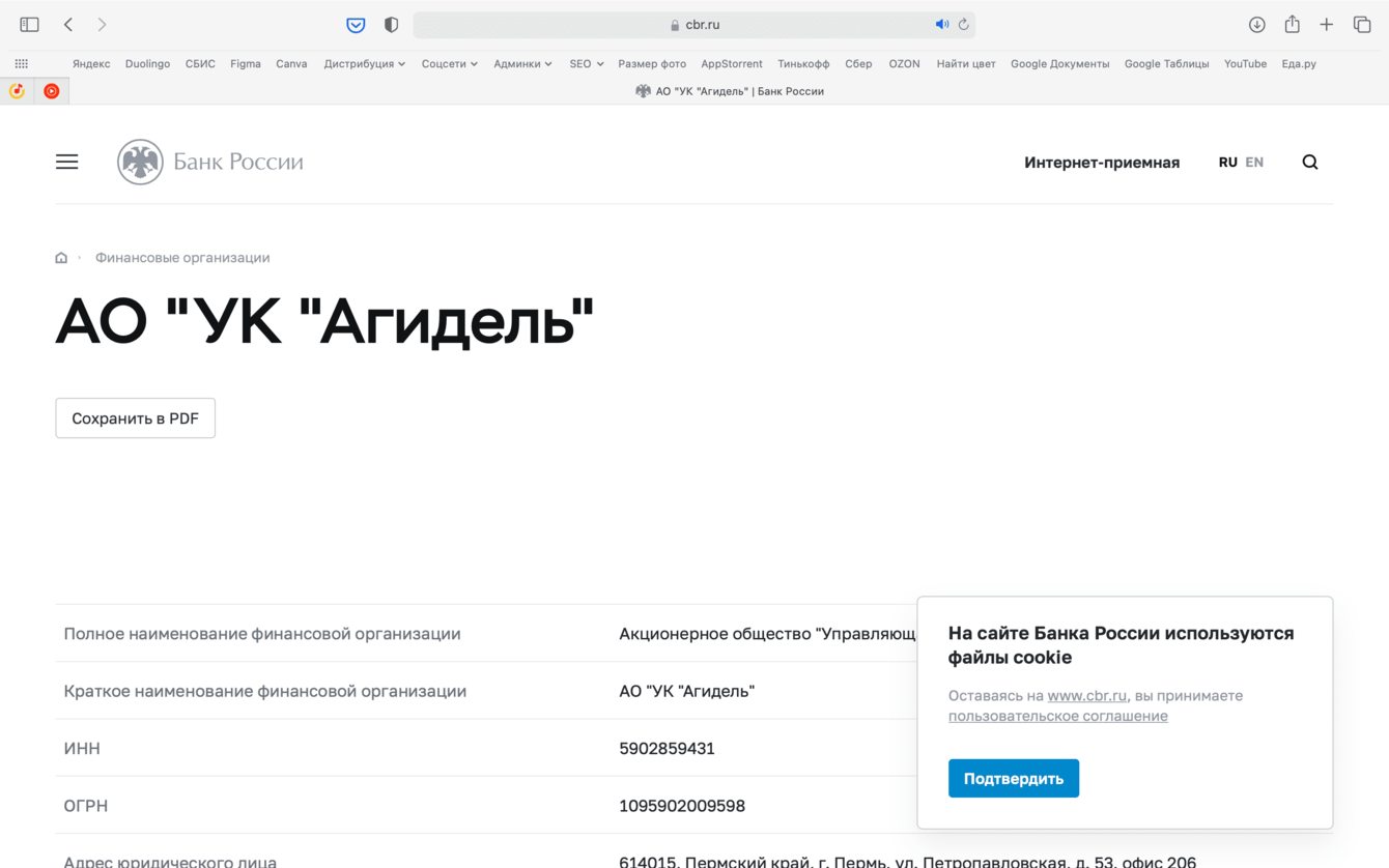 По ссылке в хедере пользователь попадает на страницу Банка России, где представлена информация об АО «Агидель». Часть пользователей сразу изучит официальные данные и не потратит время на самостоятельный поиск по сайту ЦБ РФ.