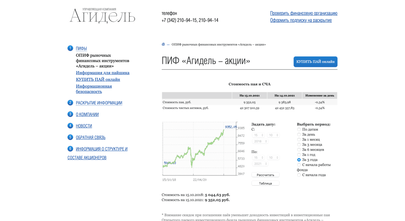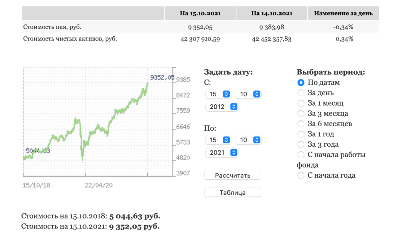 Пользователь выбирает временной отрезок и смотрит, как изменилась стоимость пая за указанный период. После этого он принимает решение и о покупке и переходит по ссылке.