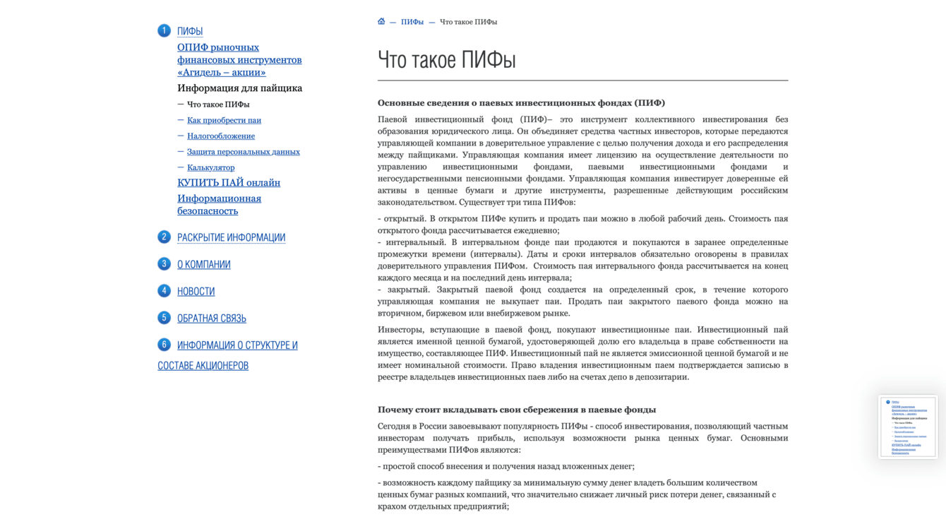 В остальных разделах находится информация о ПИФах, информационной безопасности, налогах и т.д. Справа от каталога - тексты и статьи.