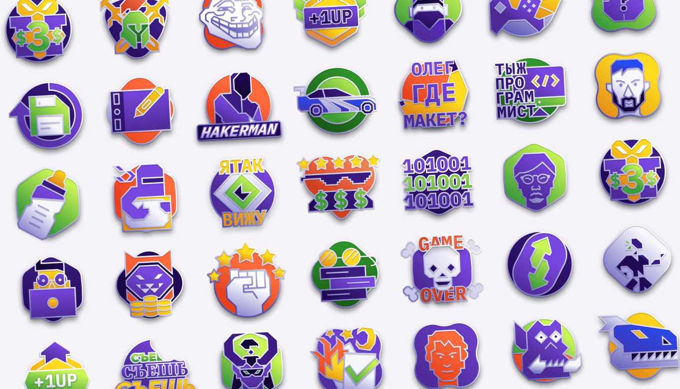 На проекте очень разветвленная система ачивок, все-таки нужно подбадривать юных творцов. Поэтому мы вложили немало сил в систему поощрения. Тут речь не только о визуале, но и об идеях. Каждая ачивка продумывалась исходя из текущих трендов, чтобы порадовать легким юмором и не отбить мотивацию пользоваться платформой дальше.