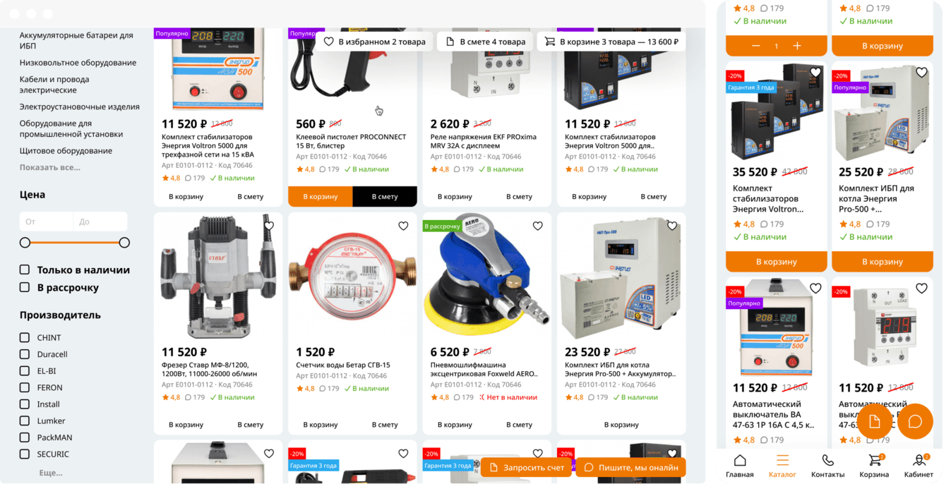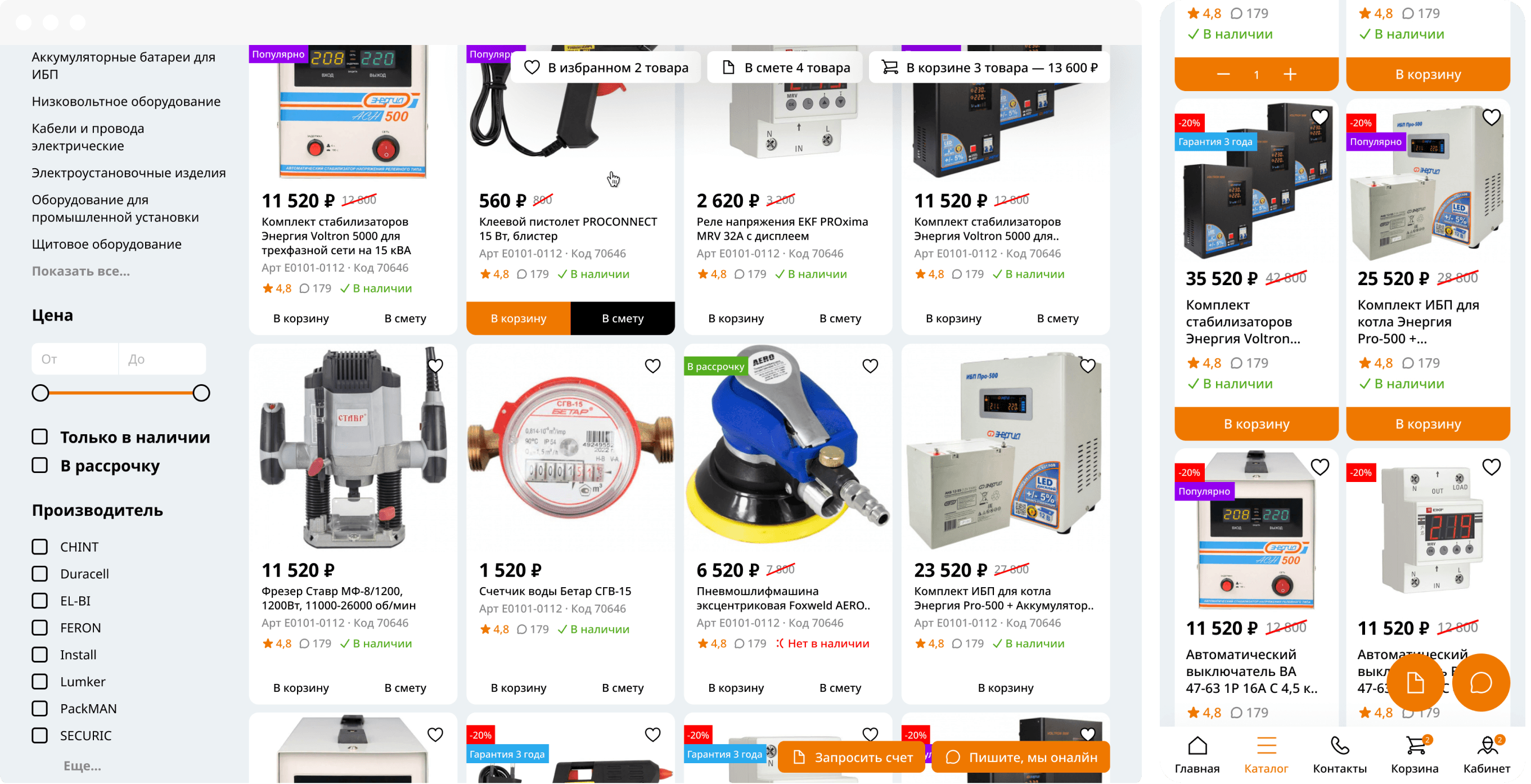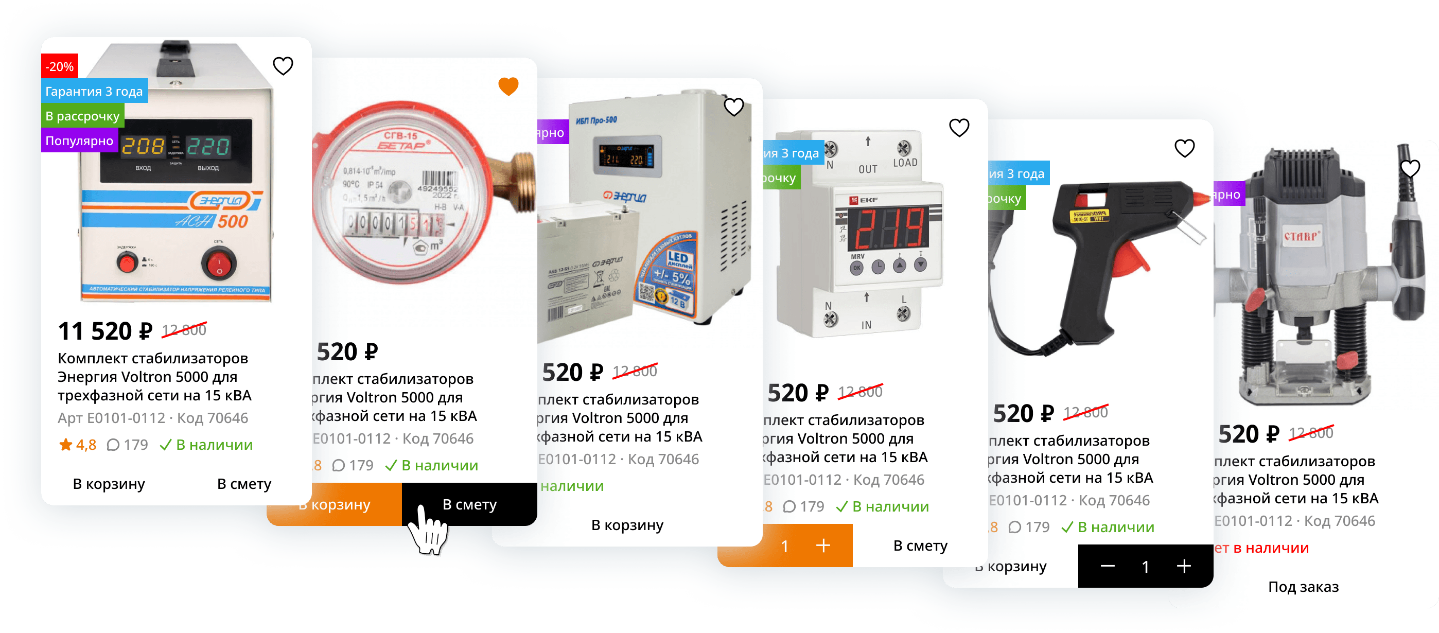 Карточки умеют подстраиваться под пользователя. Для монтажника появляется кнопка добавления товара в смету.