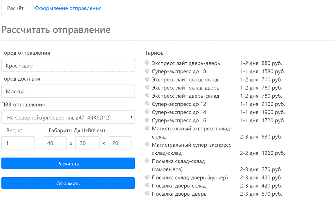 Вывод возможных вариантов доставки в зависимости от размеров и веса товара;