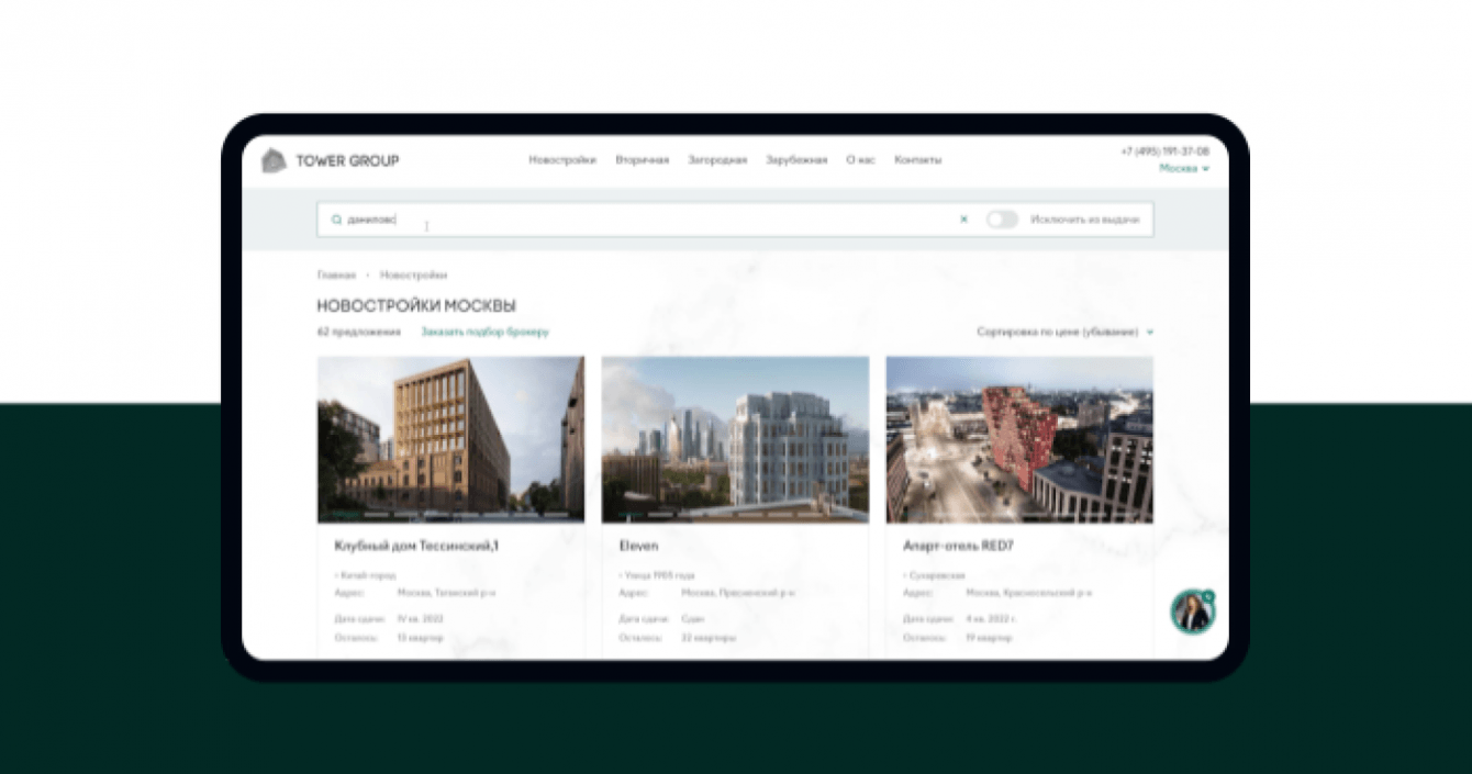 - Карточки объектов и квартир с подробным описанием, рендерами и планировками;