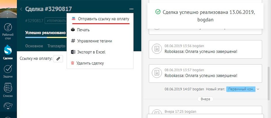 После успешной оплаты клиент получает на почту чек об оплате, а в истории сделки появится уведомление от Robokassa «Оплата успешно завершена» и сделка автоматически переходит в статус, выбранный пользователем. Сам факт формирования состав корзины тоже сохраняется в истории действий со сделкой.