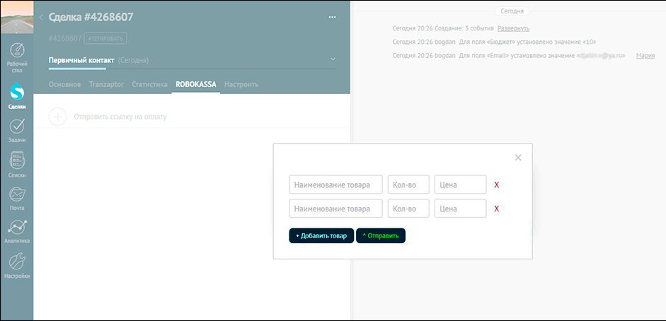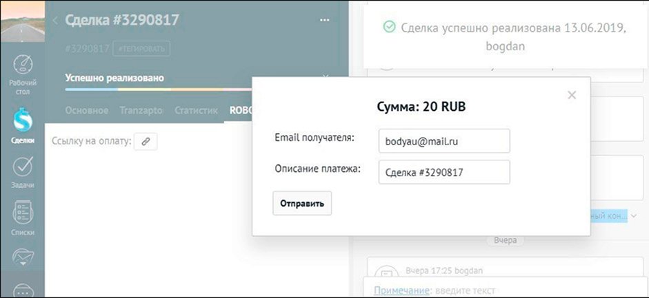 Если опция «Фискализация» в настройках отключена во вкладке ROBOKASSA появиться кнопка с текстом «Ссылка на оплату», которую можно скопировать и отправить клиенту. Так же в меню действий со сделкой появиться кнопка «Отправить ссылку на оплату» и форма для отправки клиенту с данными о сделке (с возможностью изменения данных). Состав корзины в этом случае не формируется.