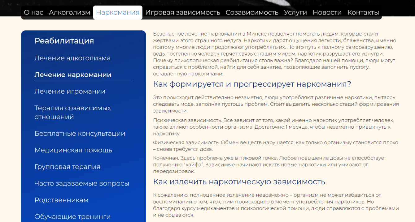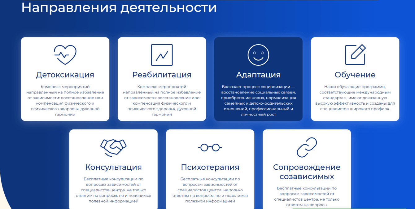 В результате успешно завершенного проекта сайт реабилитационного центра был создан с учетом всех требований и целей заказчика. Он предоставляет информацию о услугах центра и привлекает новых клиентов благодаря высокому уровню дизайна, функциональности и продвижению в поисковых системах. Множество запросов связанных с услугами центра теперь попали в топ выдачи, что способствует привлечению целевой аудитории и росту бизнеса.