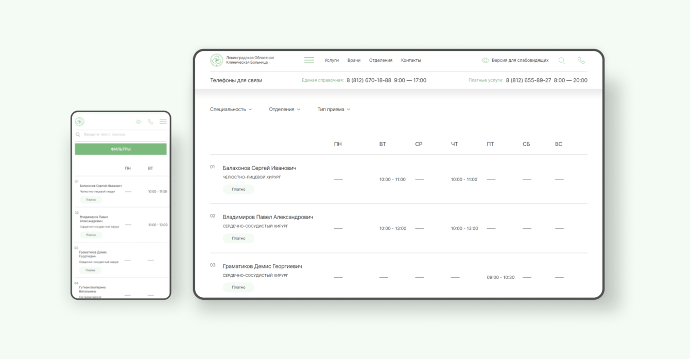 Расписание врачей мы реализовали в виде адаптивной таблицы. В ней наглядно представили информацию о времени, месте и типе приема.